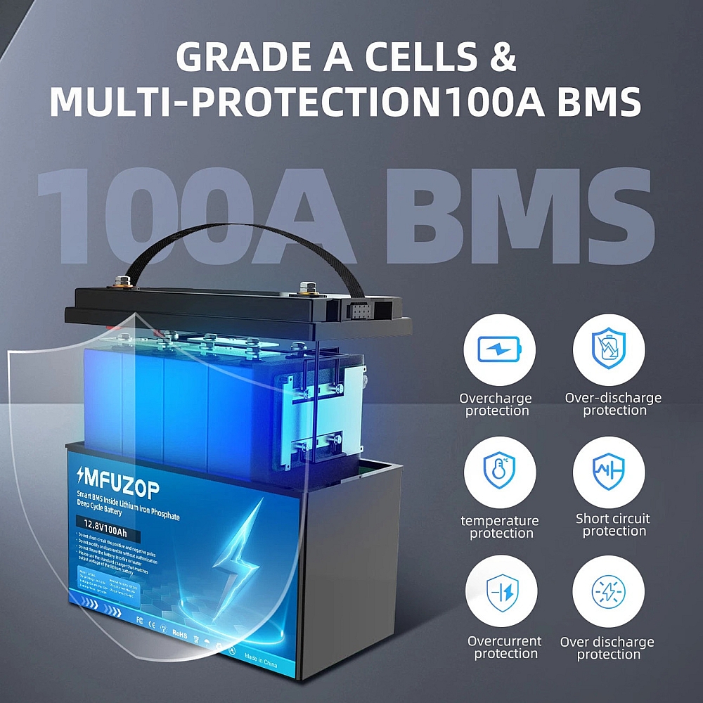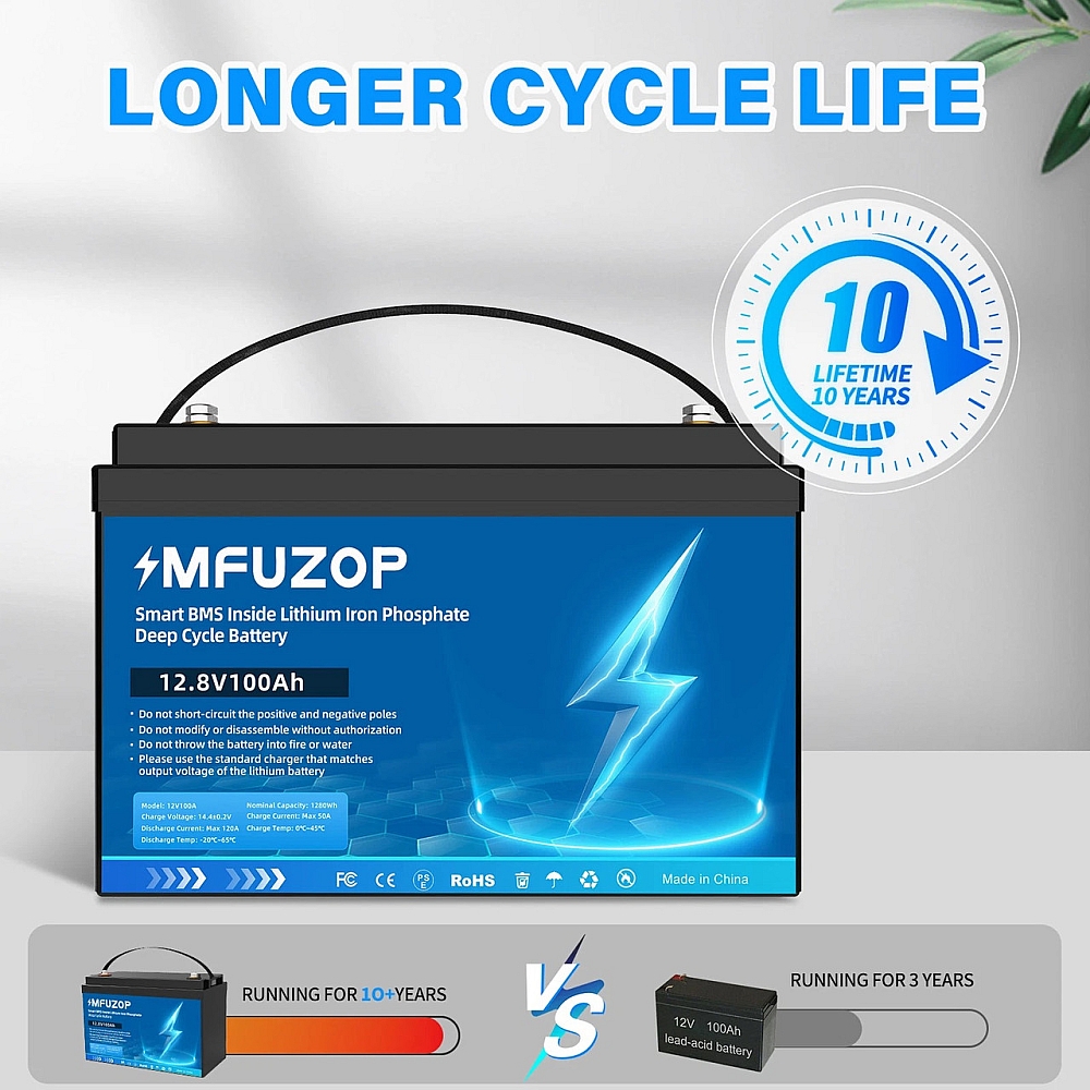 Акумулятор Mfuzop LiFePO4 12,8V 100Ah — це сучасна літій-залізо-фосфатна батарея глибокого циклу, створена для стабільного та безпечного енергоживлення в автономних системах, морських застосуваннях, кемперах, човнах, сонячних електростанціях та резервному живленні. Завдяки високій якості осередків та захисту класу IP65 акумулятор забезпечує надійну роботу в широкому діапазоні температур і підвищених умовах вологості.