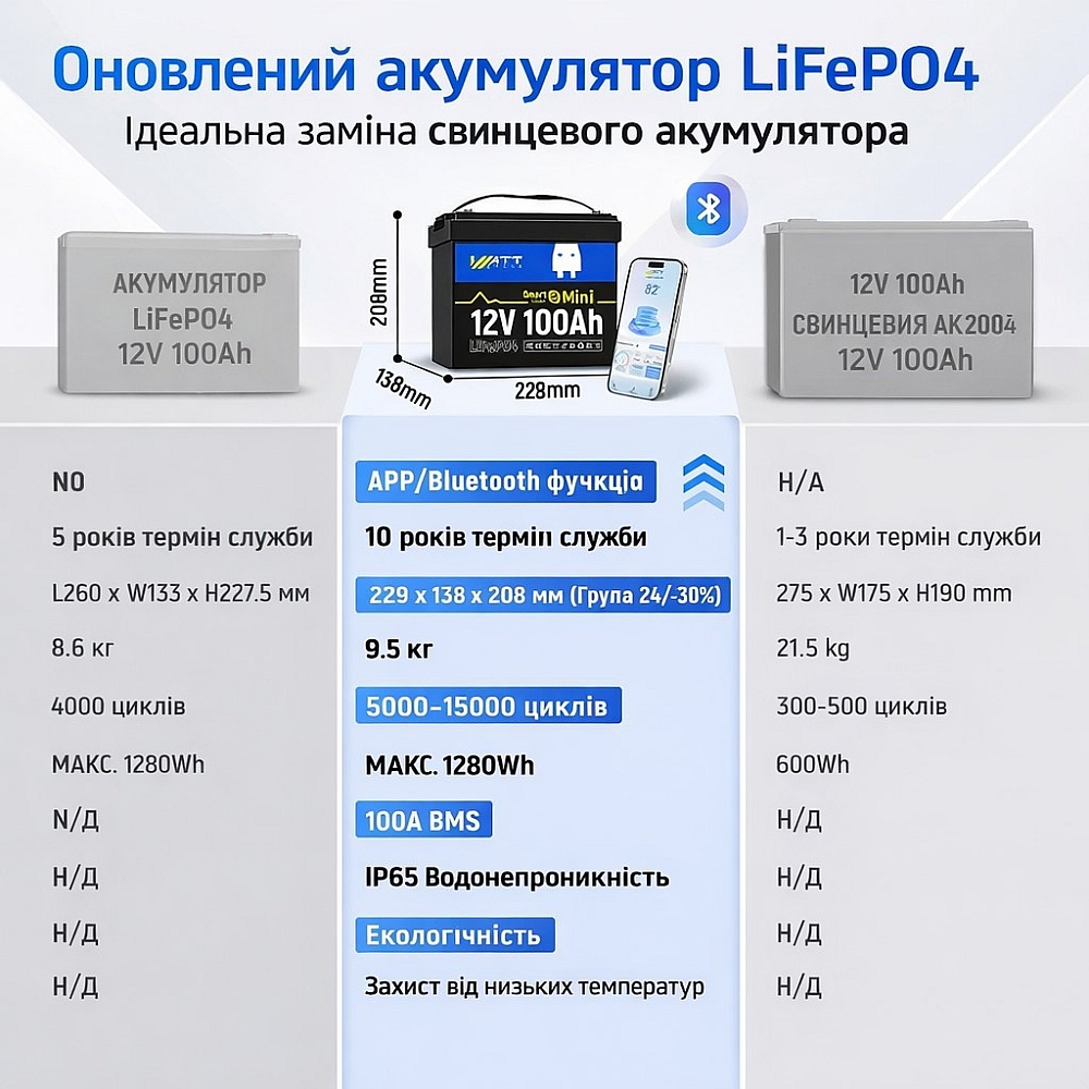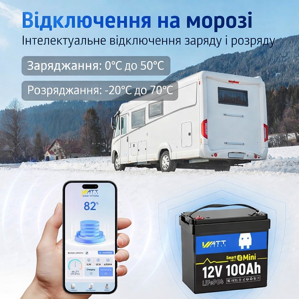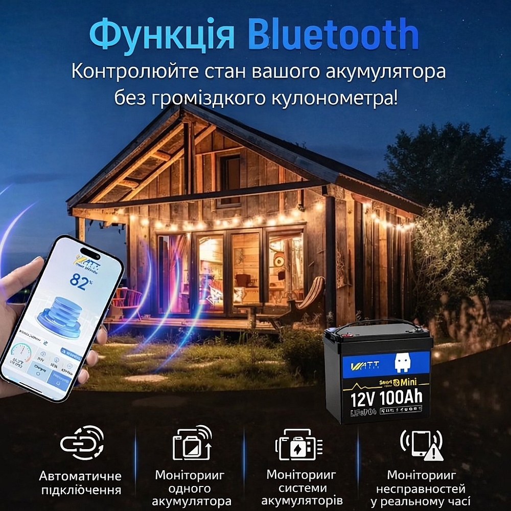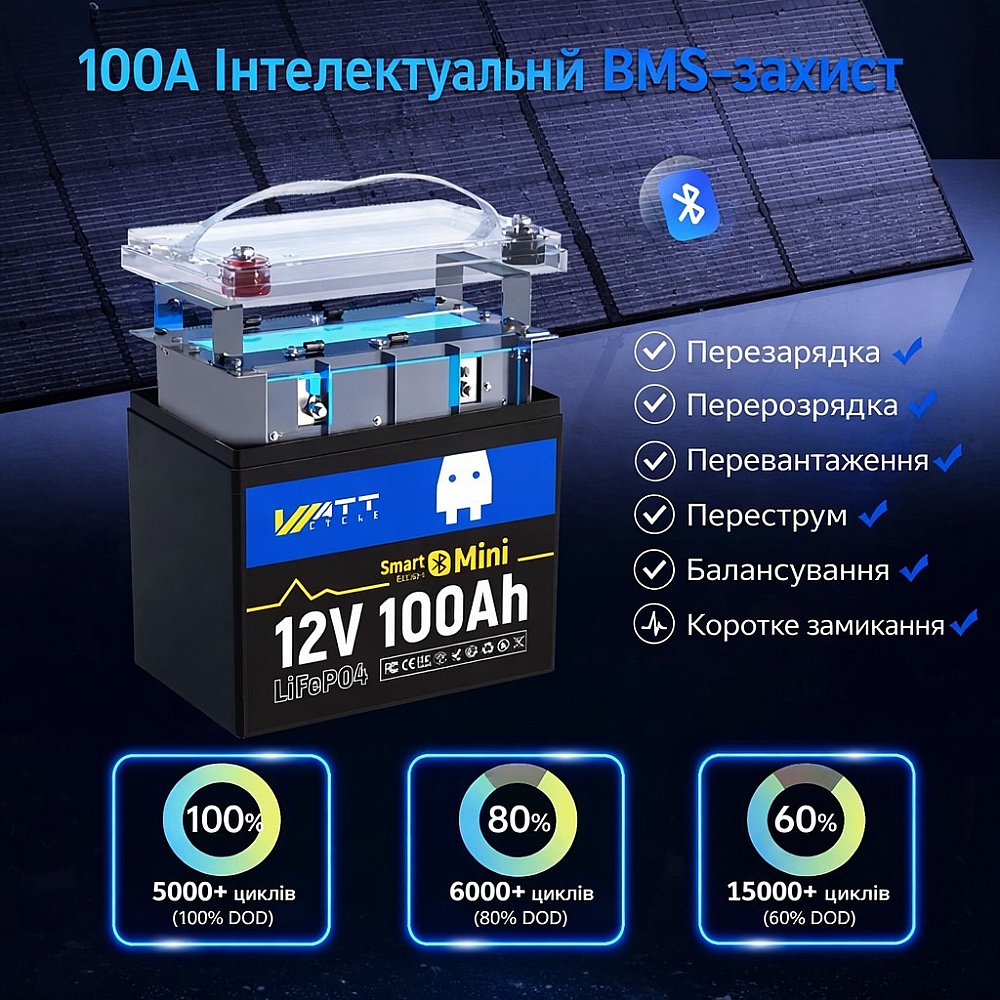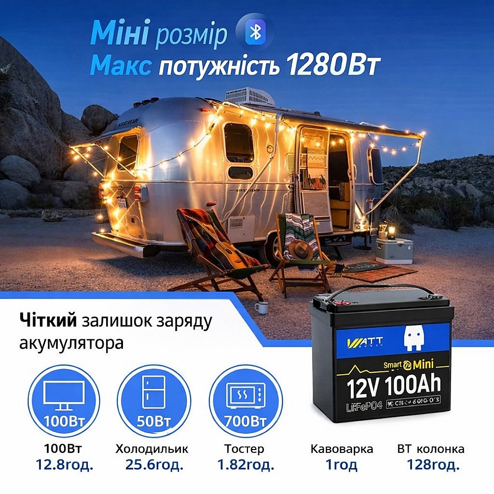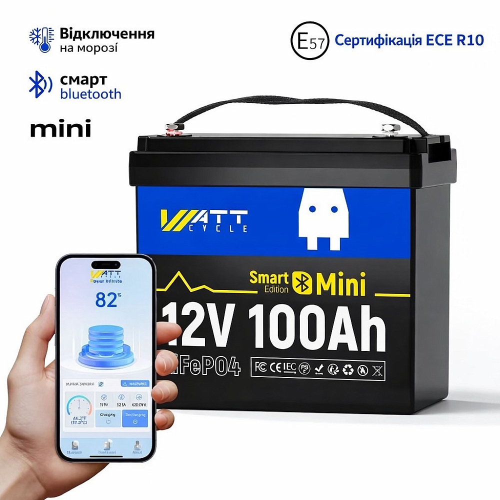 Модель Mini розроблена як вдосконалена заміна традиційних свинцево-кислотних АКБ. Вона має зменшені габарити та вагу, але зберігає повну ємність 100 А·год і корисну енергію 1280 Вт·год. Вбудований Bluetooth-модуль дозволяє в режимі реального часу контролювати стан батареї через мобільний застосунок WattCycle — напругу, рівень заряду, струм, температуру та історію роботи.