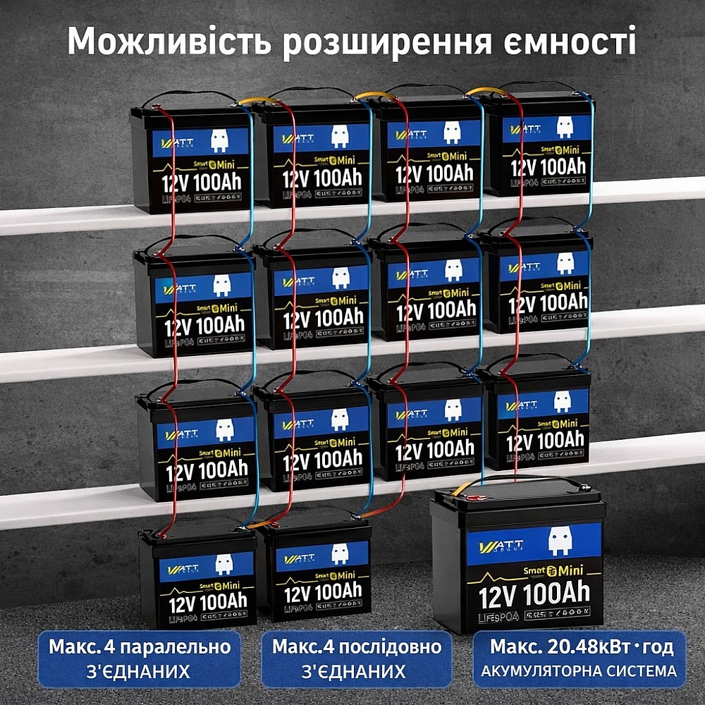 Акумулятор підтримує послідовне та паралельне з’єднання (до 4S4P), що дає змогу масштабувати систему зберігання енергії до 20,48 кВт·год. Це робить його універсальним рішенням як для компактних автономних систем, так і для більш потужних конфігурацій.