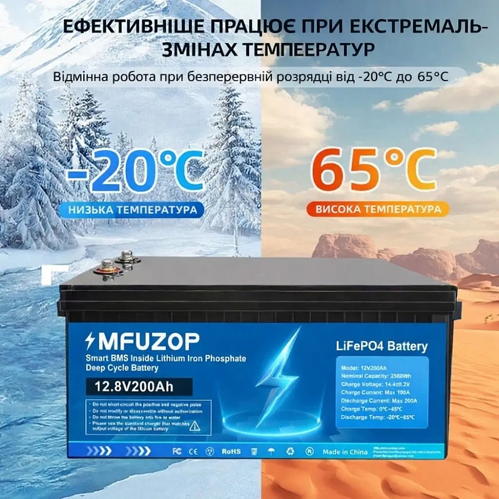 Акумулятор побудований на базі технології LiFePO4, що забезпечує підвищену безпеку, стабільну напругу та значно довший ресурс у порівнянні зі свинцево-кислотними батареями. Номінальна напруга становить 12,8 В, ємність — 200 А·год, а запас енергії — 2560 Wh, що дозволяє забезпечувати тривале автономне живлення обладнання під час відключень електроенергії.