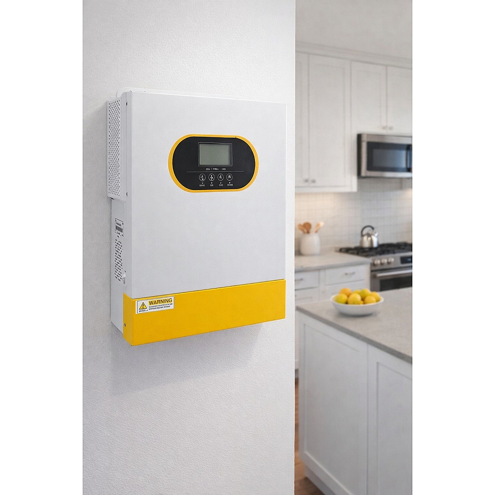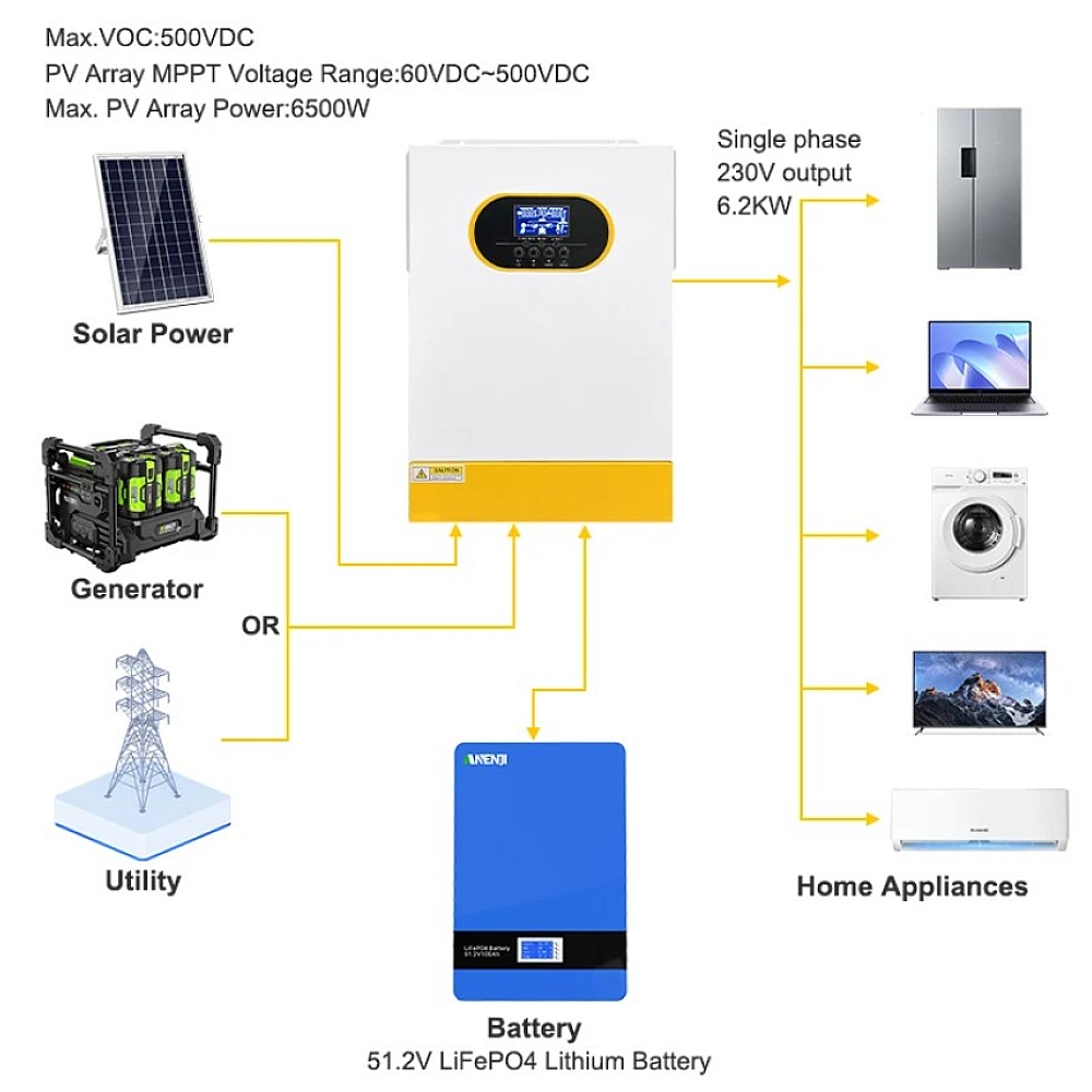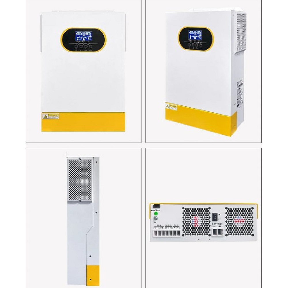 Інвертор здатний працювати навіть без акумулятора, використовуючи сонячну енергію або мережу напряму. Вбудований контролер MPPT 120 А забезпечує максимальну ефективність роботи фотоелектричних панелей при напрузі 60-500 В DC.