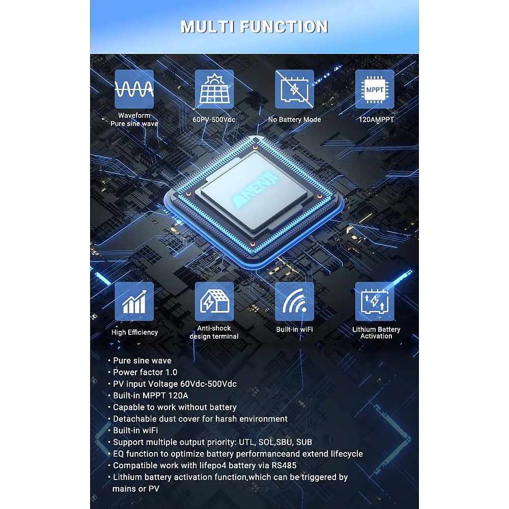 Інвертор здатний працювати навіть без акумулятора, використовуючи сонячну енергію або мережу напряму. Вбудований контролер MPPT 120 А забезпечує максимальну ефективність роботи фотоелектричних панелей при напрузі 60-500 В DC.