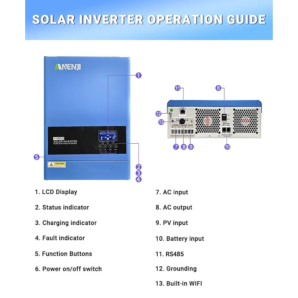 Гібридний сонячний інвертор Anenji ANJ-6200W-48V-WIFI — це високопродуктивне рішення для автономних та резервних систем живлення. Він поєднує в собі інвертор, сонячний MPPT-контролер та зарядний пристрій, забезпечуючи стабільну подачу енергії для будинку, офісу, майстерні та інших об’єктів.