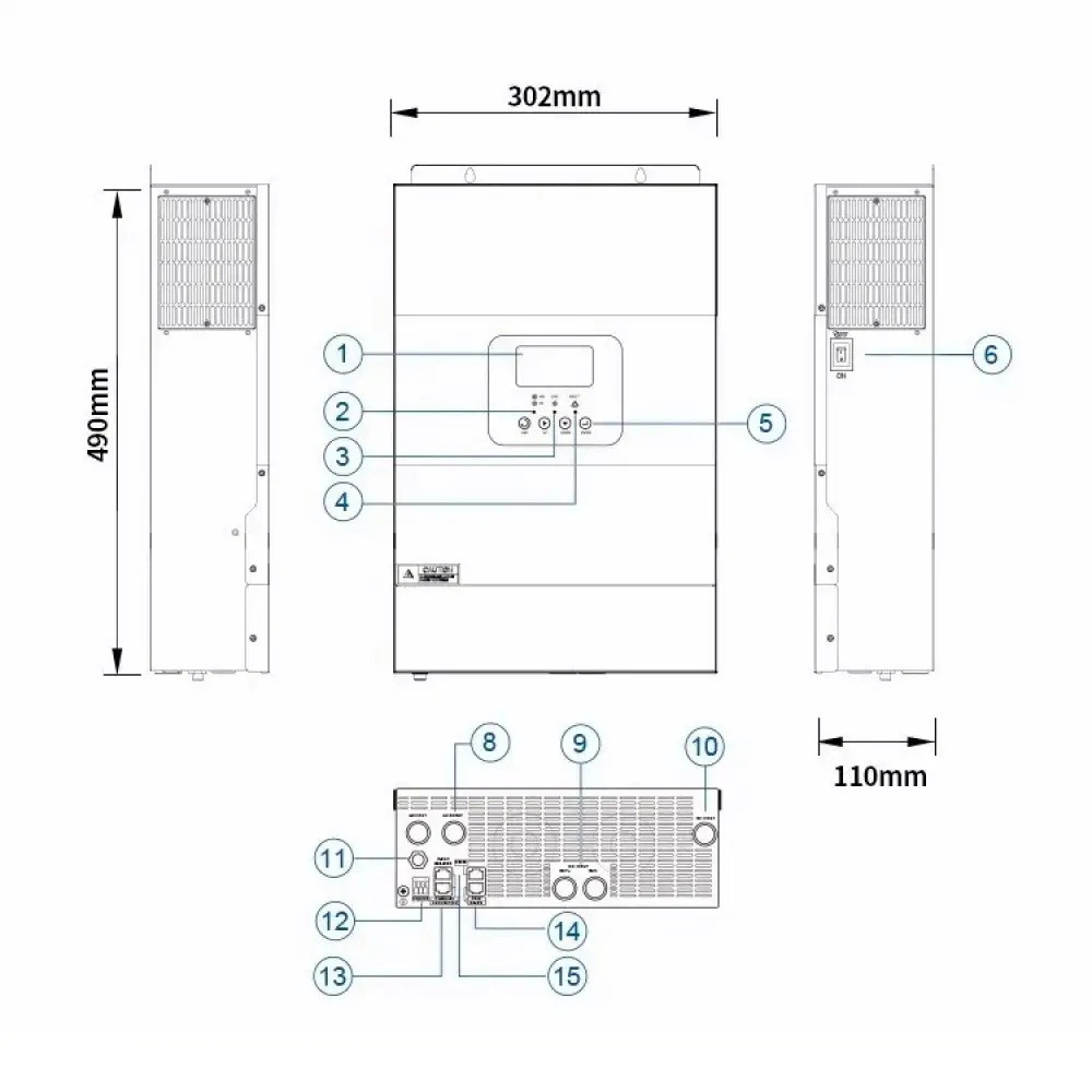 Інвертор підтримує однофазну та трифазну конфігурацію, має номінальну потужність 5500W/5500VA та пікову потужність 11000VA. Максимальна вхідна потужність від сонячних панелей — 5500W, з MPPT-діапазоном 90-450VDC. Чиста синусоїда на виході забезпечує безпечну роботу побутової техніки та електроніки.