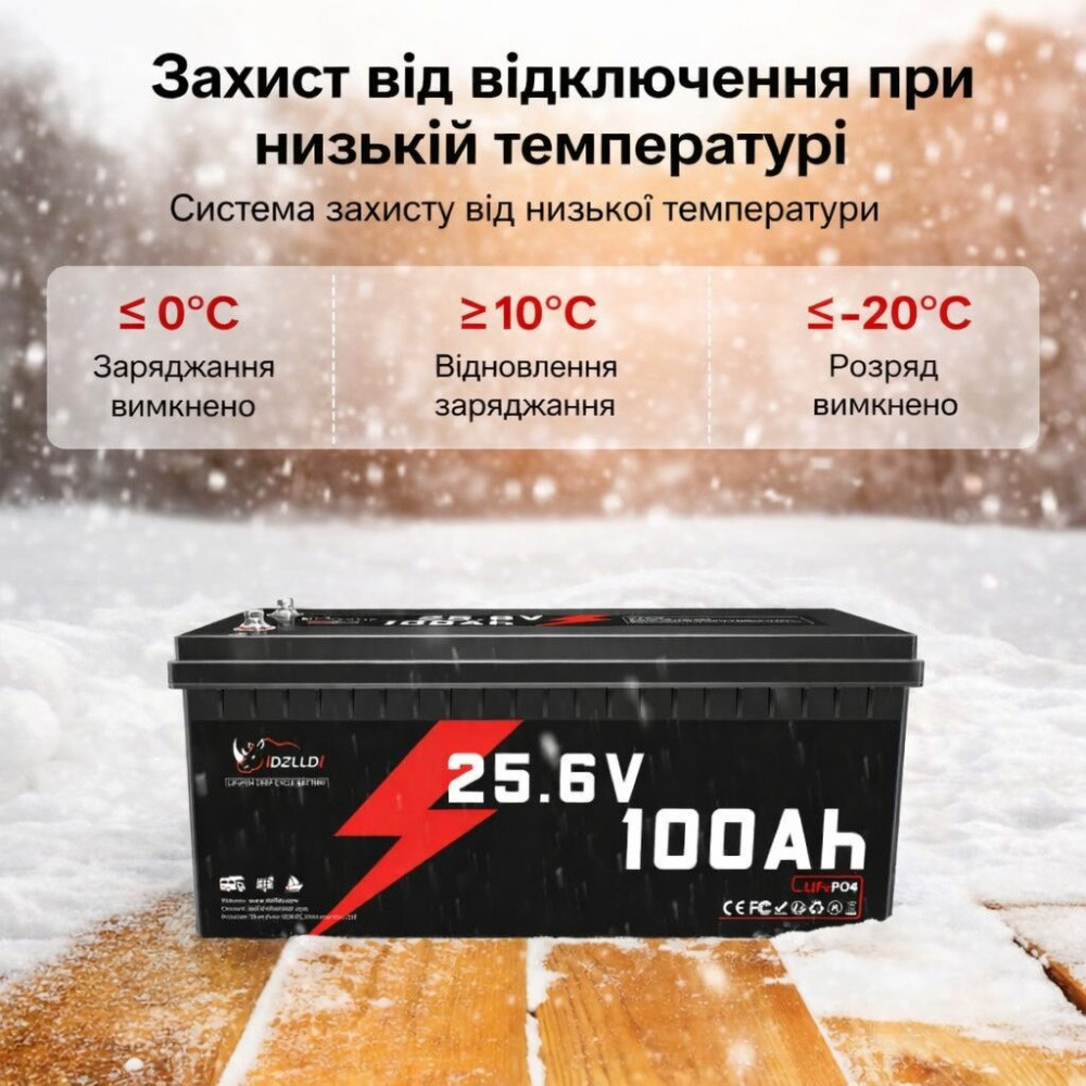 У комплект входять 2 акумулятори Idzlldi 24V 100Ah (25,6 В) LiFePO4. Кожна батарея має енергоємність 2560 Вт·год, що забезпечує високий запас автономії. Вбудована BMS 100 А гарантує повний захист від перезаряду, глибокого розряду, короткого замикання та перегріву.