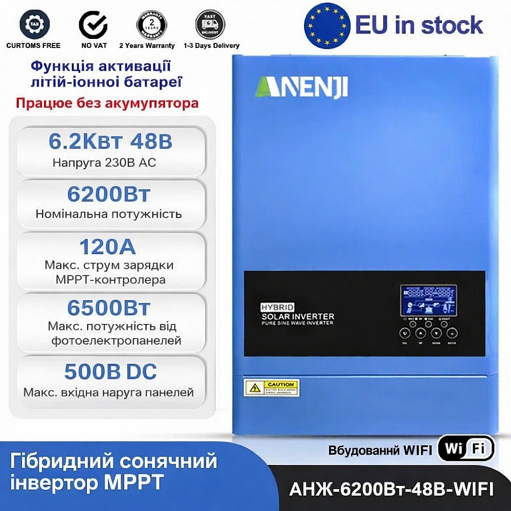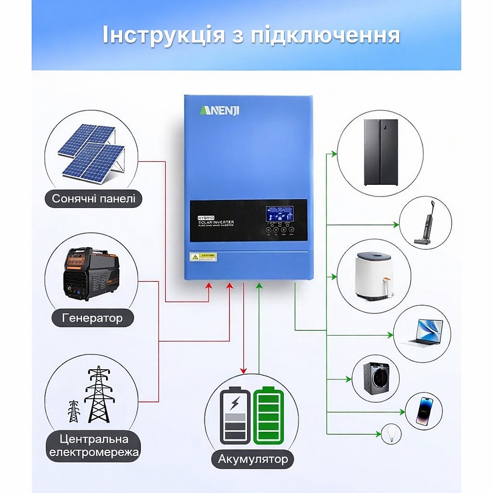 Гібридний інвертор Anenji поєднує в одному корпусі інвертор, MPPT-контролер та зарядний пристрій. Він формує чисту синусоїду, що забезпечує повну сумісність із чутливою побутовою та офісною технікою: холодильниками, котлами, насосами, комп’ютерами, серверним обладнанням, системами безпеки та освітленням.