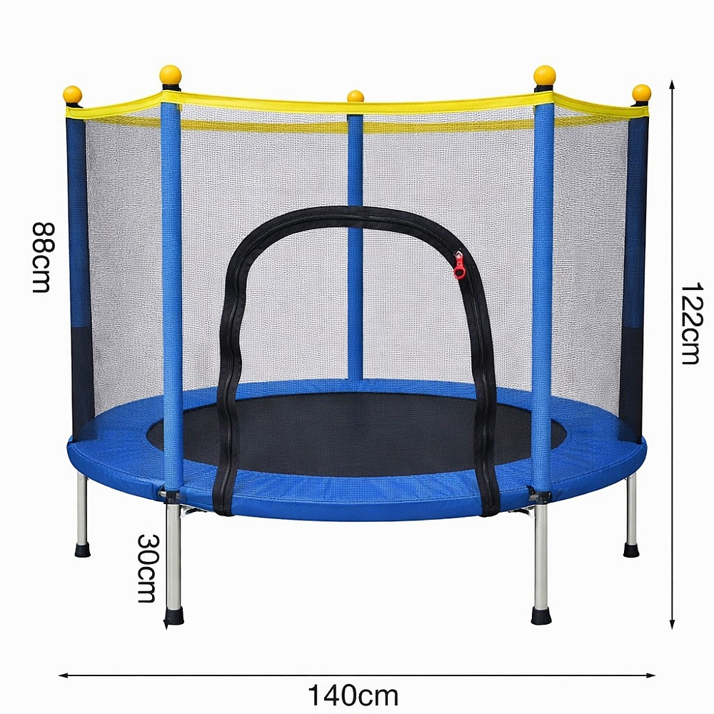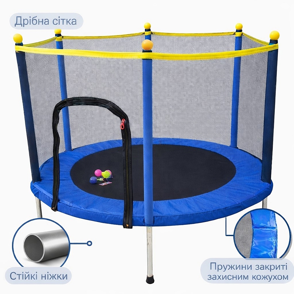 Модель оснащена захисною сіткою по периметру, яка створює безпечний простір для дитини та знижує ризик випадкового падіння. Міцне стрибкове полотно забезпечує пружний відскок, а посилена рама гарантує довговічність конструкції навіть при активному використанні.