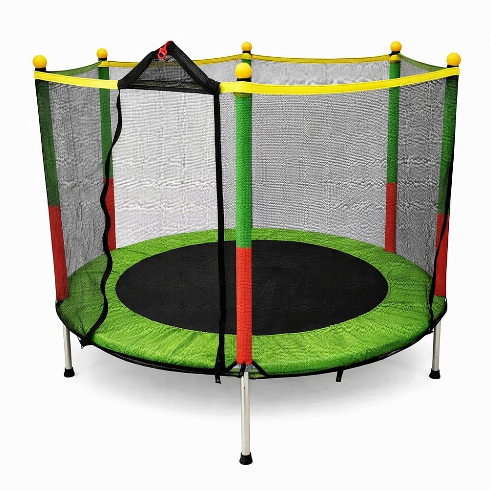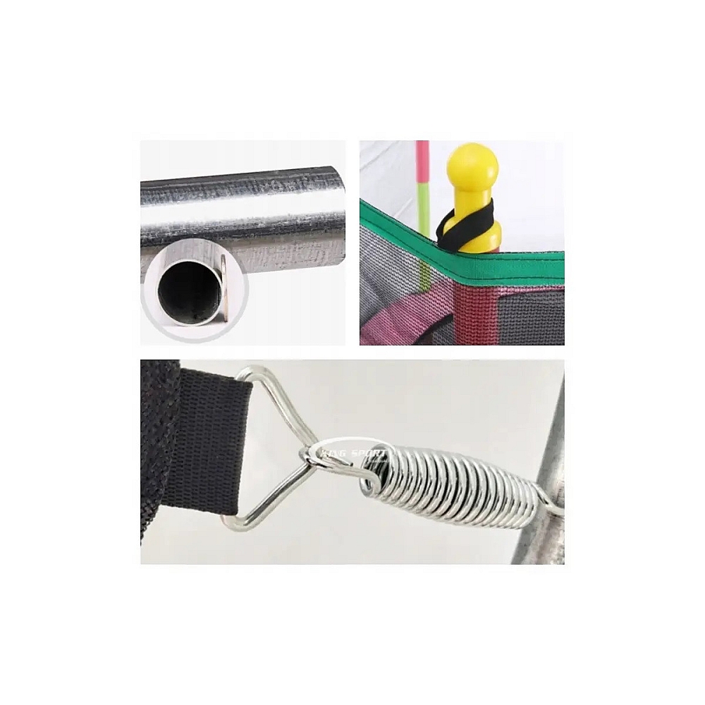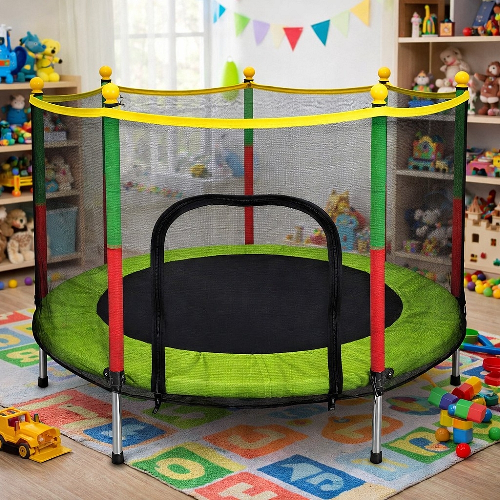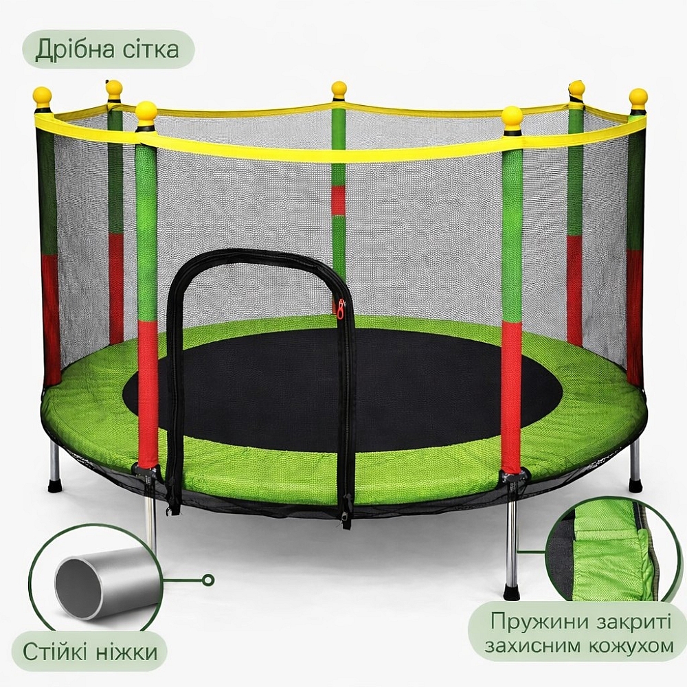 Модель оснащена захисною сіткою по периметру, яка створює безпечний простір для дитини та знижує ризик випадкового падіння. Міцне стрибкове полотно забезпечує пружний відскок, а посилена рама гарантує довговічність конструкції навіть при активному використанні.