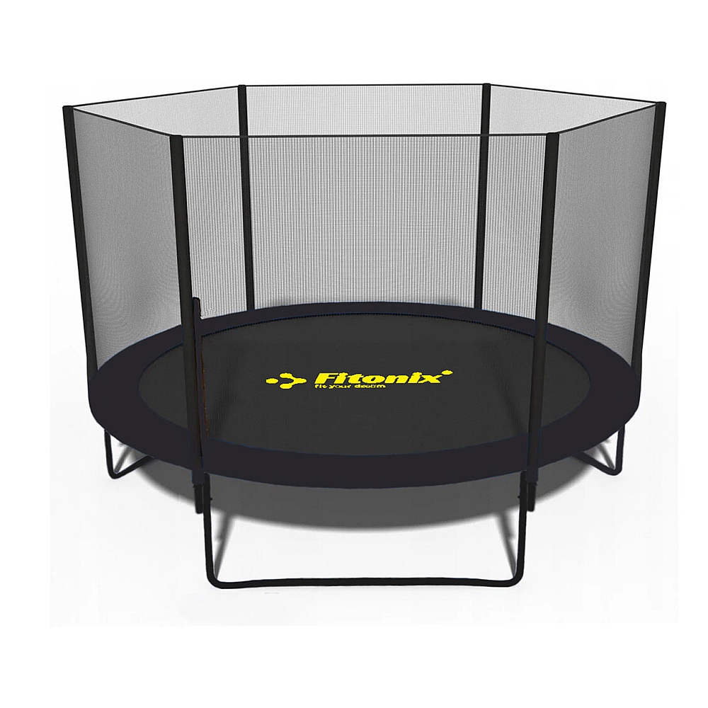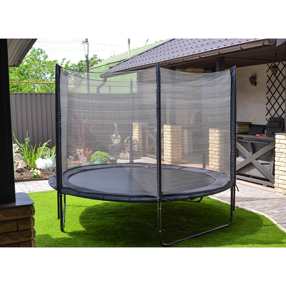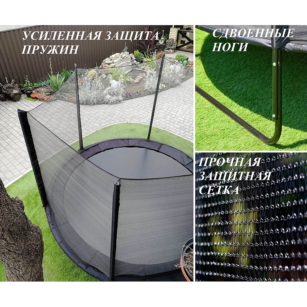 Його пружини мають антикорозійне покриття, а м’яке поліпропіленове полотно відрізняється високою зносостійкістю та пружністю. Захисна сітка, що оточує батут, дозволяє вільно стрибати без ризику випадання, а конструкція з нержавіючої сталі гарантує стійкість і довговічність.
