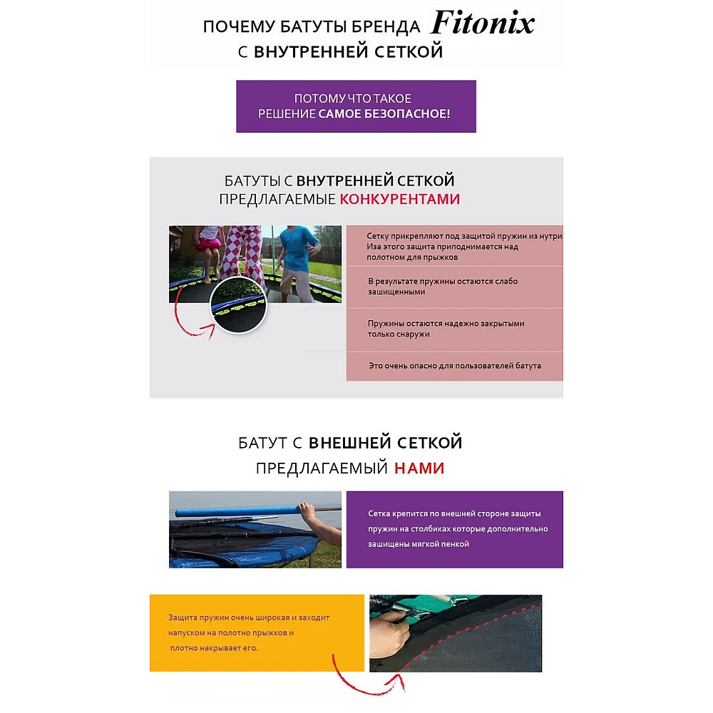 Садовий батут Fitonix діаметром 312 см — це чудовий вибір для активного відпочинку дітей та дорослих. Його конструкція створена з урахуванням безпеки користувачів: кожен елемент батута розроблений для мінімізації ризику травм. Завдяки сертифікатам відповідності європейським стандартам безпеки (TUV і CE), батут є надійним і безпечним у щоденному використанні.