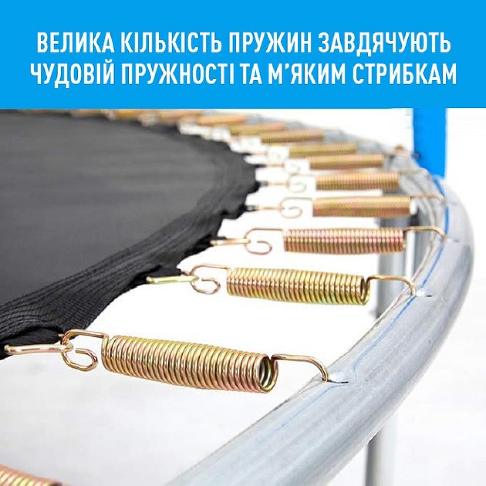 Модель витримує навантаження до 120 кг, тому підходить для всієї родини. Захисна сітка висотою 160 см створює безпечну зону для стрибків, а зручна драбина в комплекті забезпечує комфортний і безпечний підйом.