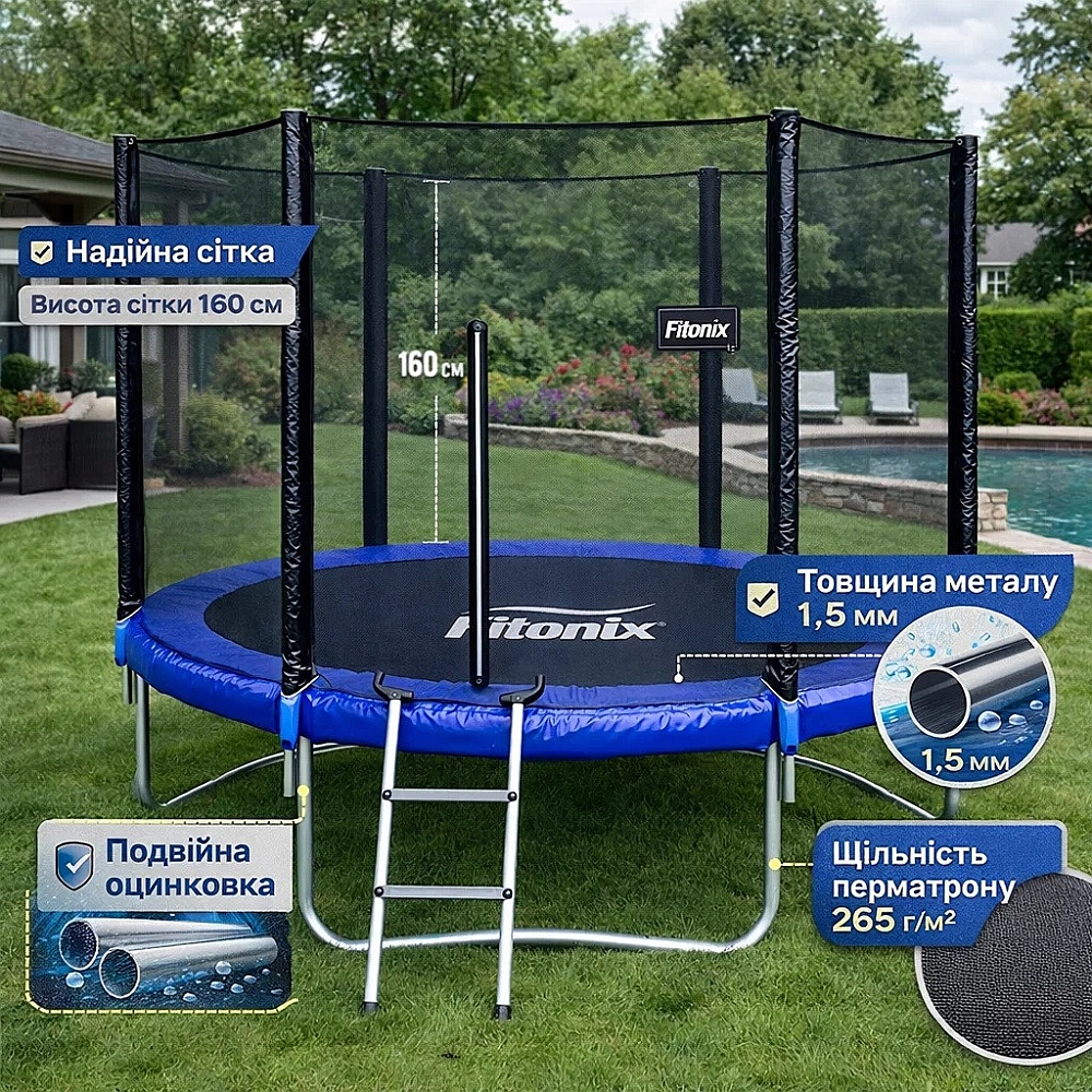 - Комплектація — батут, захисна сітка, драбина