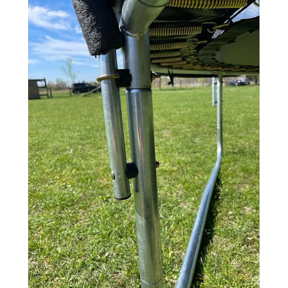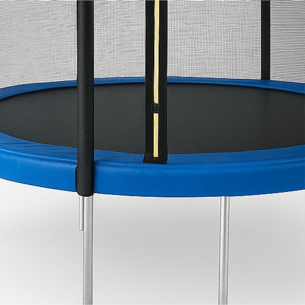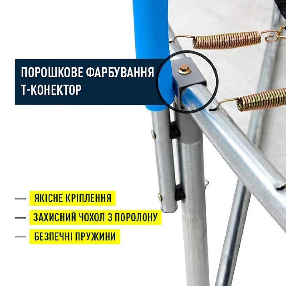 Стрибкове полотно з перматрону щільністю 265 г/м² відзначається високою зносостійкістю та стабільною пружністю. Батут витримує навантаження до 100 кг, тому підходить як для дітей, так і для підлітків. Захисна сітка висотою 150 см створює безпечну зону для стрибків.