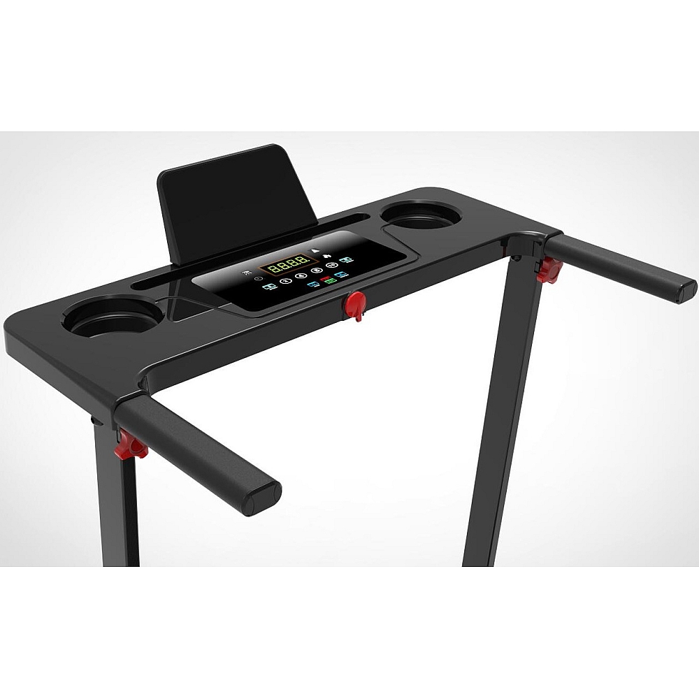Консоль обладнана зручною підставкою для планшета або телефону, а також ергономічними поручнями. Завдяки регулюванню кута нахилу, користувач може налаштовувати комфортне положення для тренувань. Транспортні коліщата полегшують переміщення, а захист заднього краю полотна підвищує безпеку.