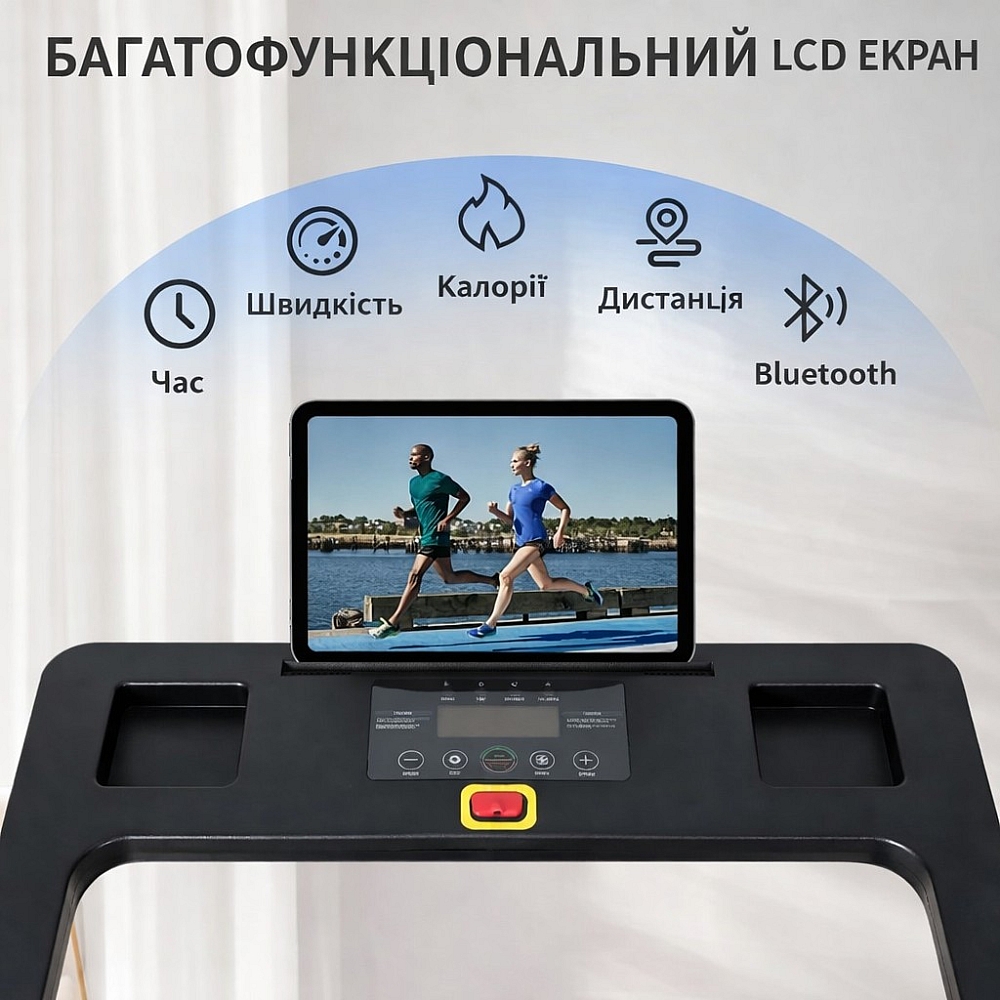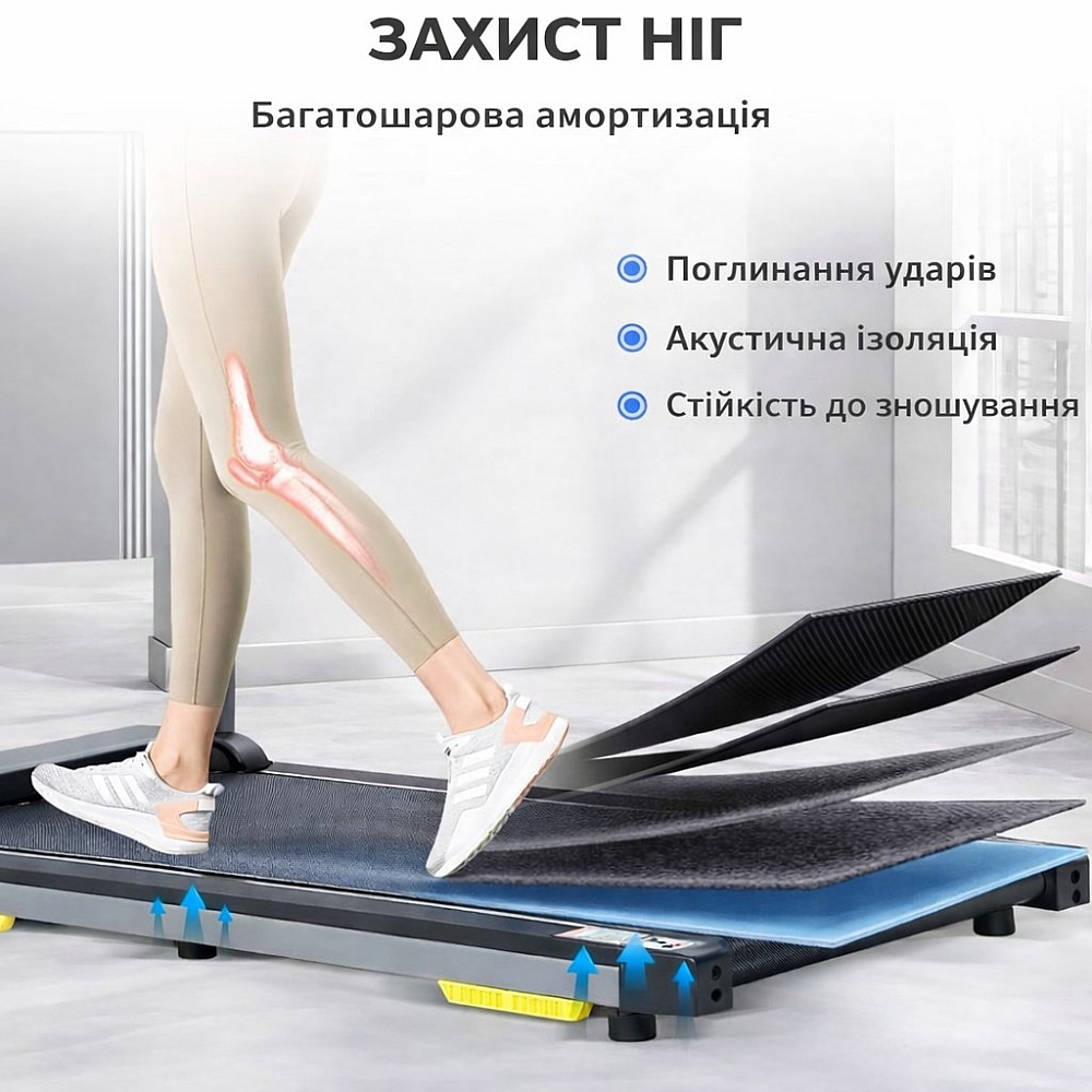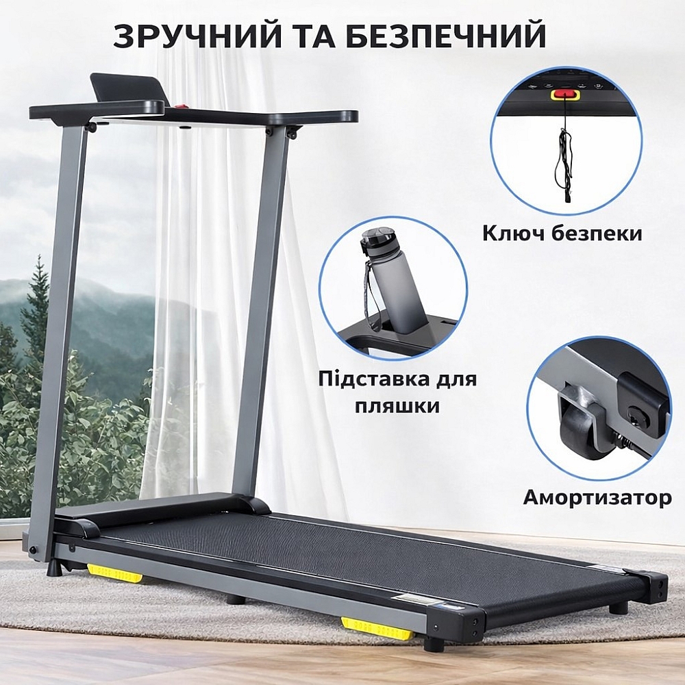 Потужний і водночас тихий двигун 1200 Вт забезпечує плавний розгін до 12 км/год. П’ятишарове бігове полотно ефективно поглинає удари та зменшує шум, створюючи комфортні умови для тренувань. Доріжка оснащена ключем безпеки для миттєвої зупинки в екстрених випадках.