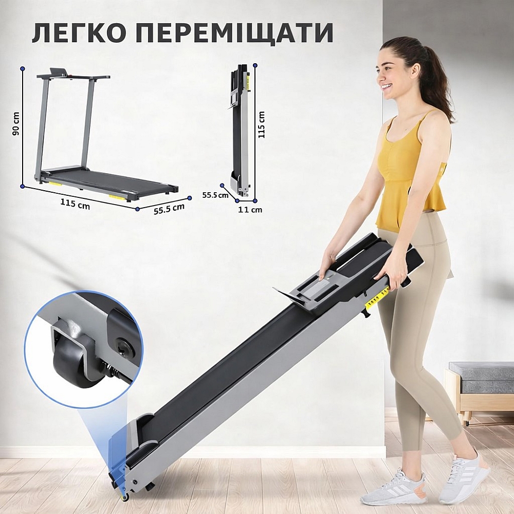 Складана конструкція дозволяє швидко зберігати тренажер після використання, а транспортні колеса забезпечують легке переміщення без зайвих зусиль.