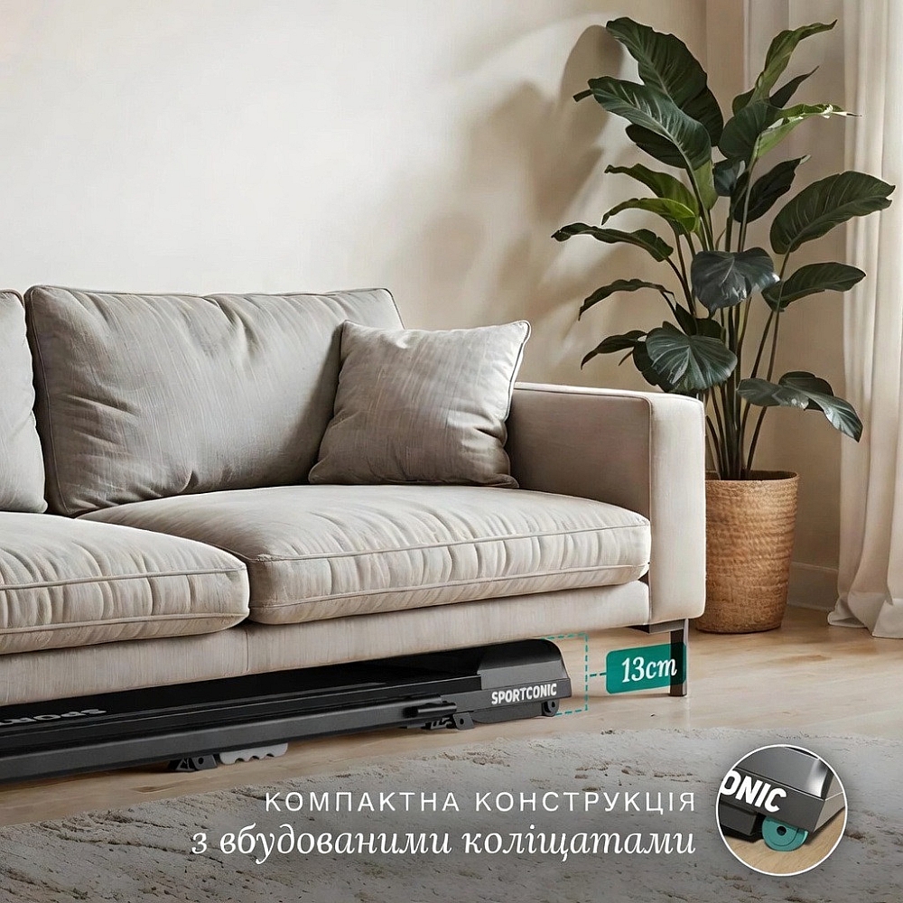 Завдяки складній конструкції дорожка не займає багато місця в приміщенні. У складеному вигляді її висота становить лише 13 см, тому її зручно зберігати під ліжком, диваном або шафою. Модель також оснащена транспортними колесами, а ще вона не потребує складного встановлення та готова до використання одразу після отримання.