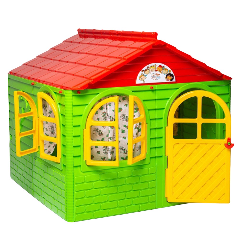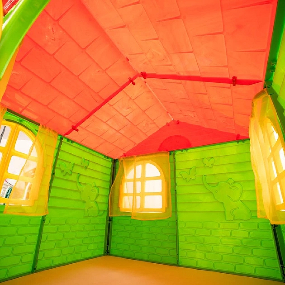Дитячий будиночок зовні дуже схожий на справжній будинок, у якому є шторки. Вікна та двері відчиняються. Завдяки великим розмірам у ньому зможе поміститися кілька дітей.