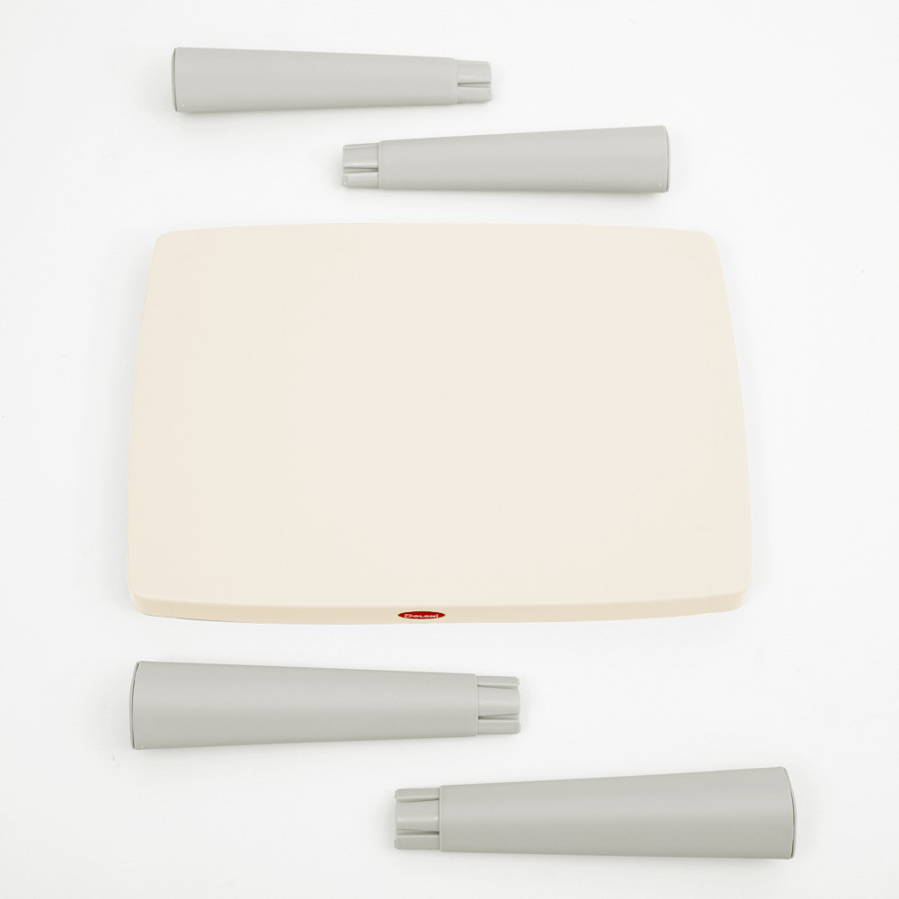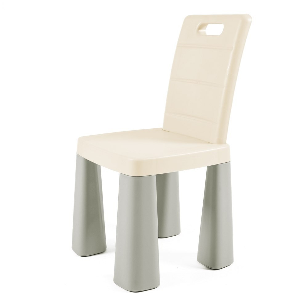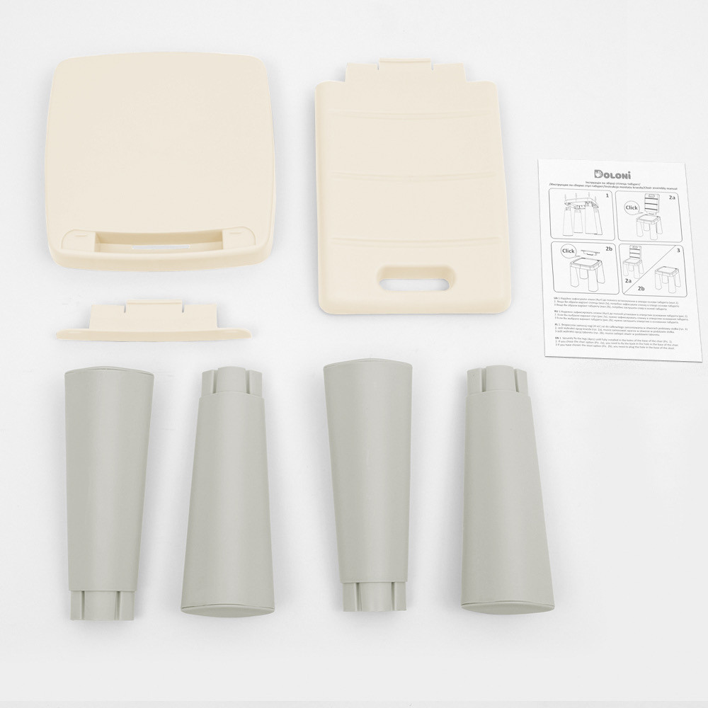 Меблі виготовлені з міцного сертифікованого пластику, який відзначається високою зносостійкістю та безпечністю для дітей. Конструкція стільців продумана таким чином, що спинка легко знімається, а замість неї можна встановити спеціальну заглушку, яка входить до комплекту. Завдяки цьому стільці можна використовувати також як табурети.