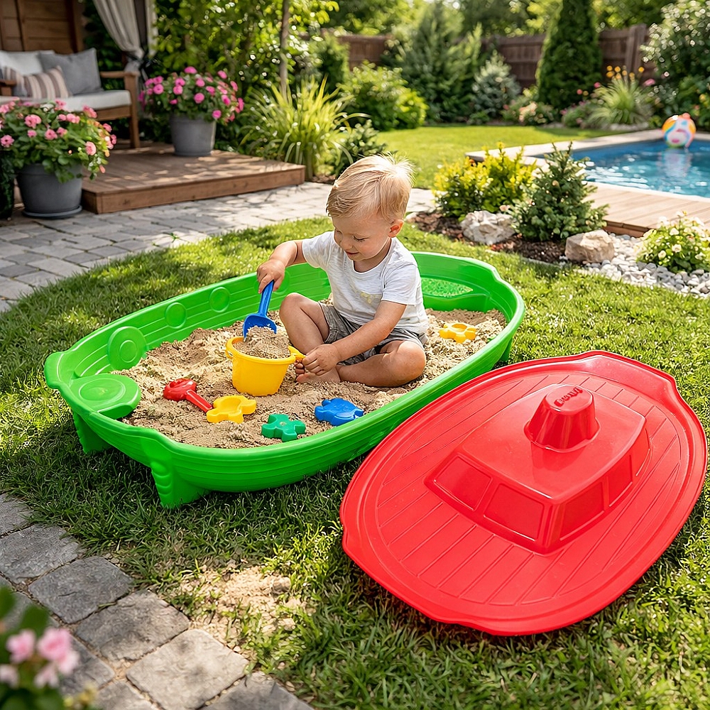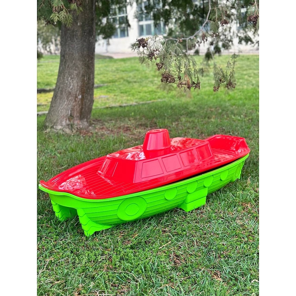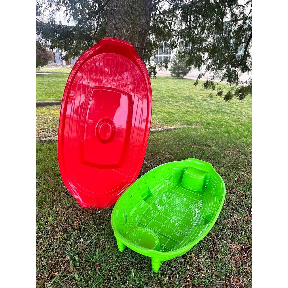 Пісочниця-басейн у формі кораблика — яскравий пластиковий ігровий майданчик, який обов'язково вразить маленьку дитину і стане її улюбленою іграшкою на довгий час. Вона дуже зручна та міцна, має стійку форму. Оснащена невеликими місцями для малюків. Верхню кришку слід використовувати після завершення дитячих ігор, тобто потрібно накривати кришкою кораблик, щоб зберігати пісочницю в чистоті. Виготовлена пісочниця-басейн із високоміцного та безпечного для дітей пластику.