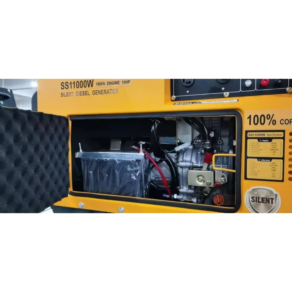 Модель оснащена електростартером, автоматичним регулюванням напруги (AVR), а також захисним шумопоглинаючим кожухом на колесах, що забезпечує комфортну, безпечну та мобільну експлуатацію.