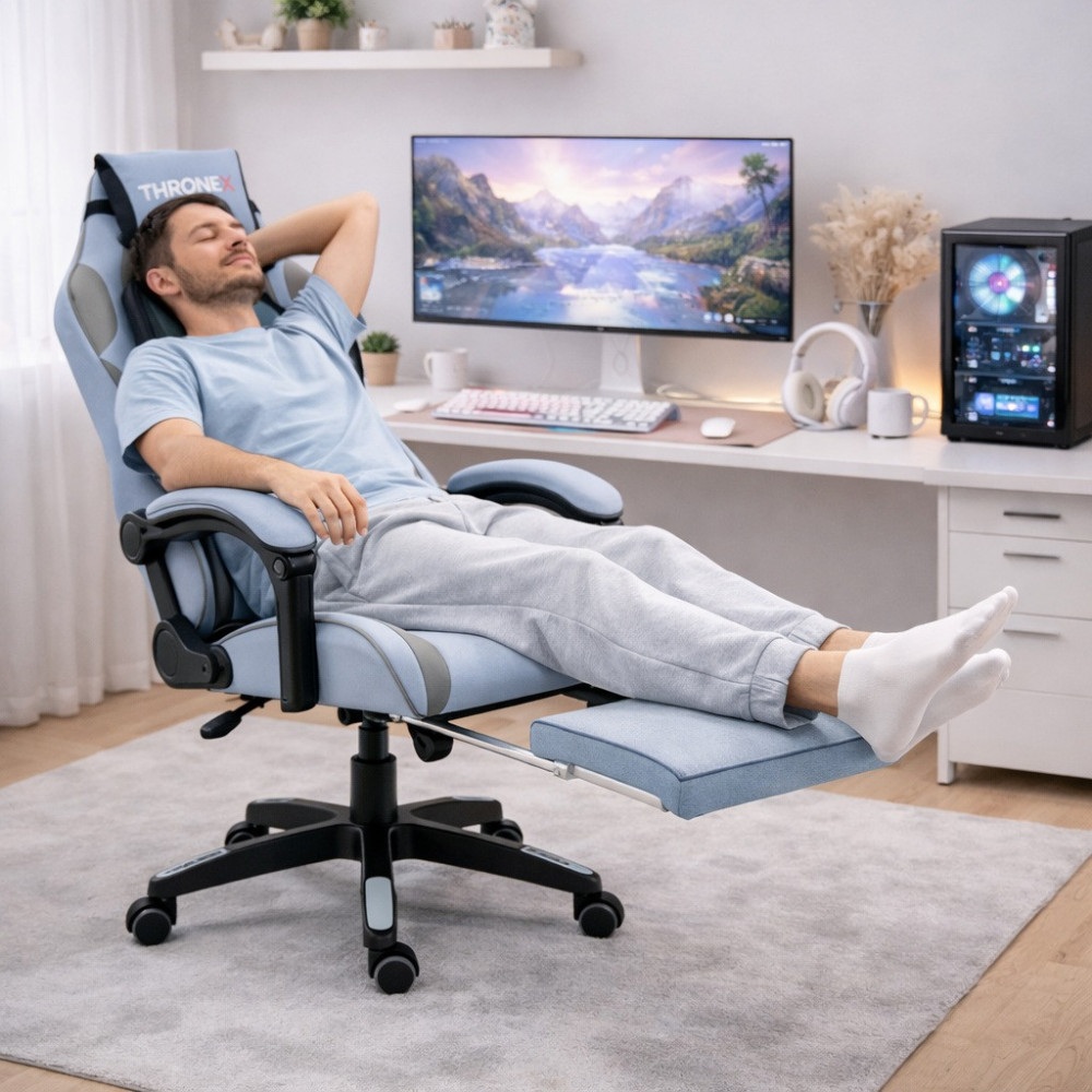 Спинка регулюється у діапазоні 90-155°, дозволяючи обрати оптимальне положення для роботи, гри або відпочинку. Висувна підставка для ніг забезпечує додатковий комфорт під час перерв.