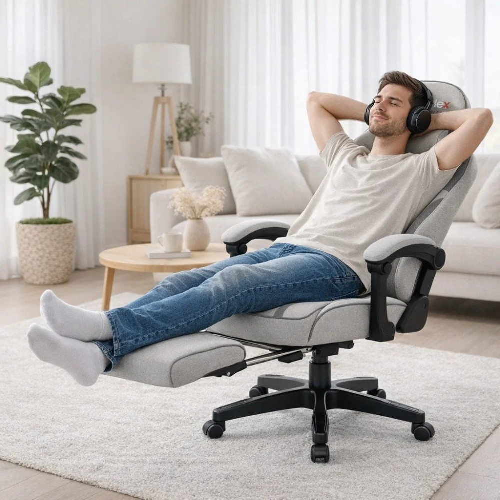 Спинка регулюється у діапазоні 90-155°, дозволяючи обрати зручне положення для роботи, гри або відпочинку. Висувна підставка для ніг забезпечує додатковий комфорт під час перерв.