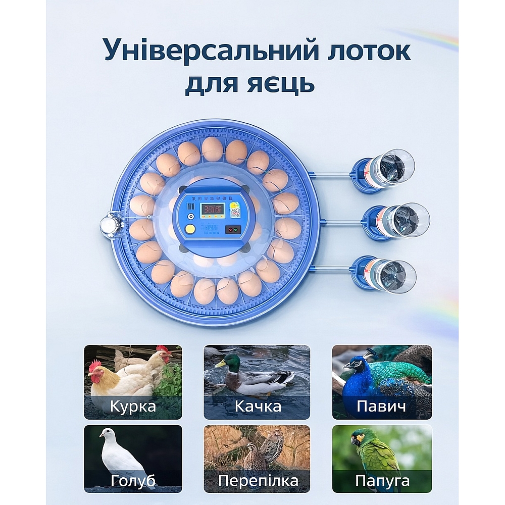 - Цифровий контролер температури — точне налаштування параметрів інкубації