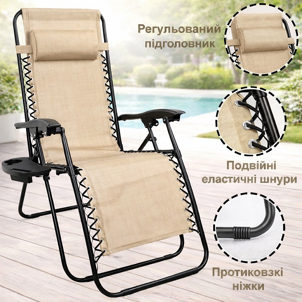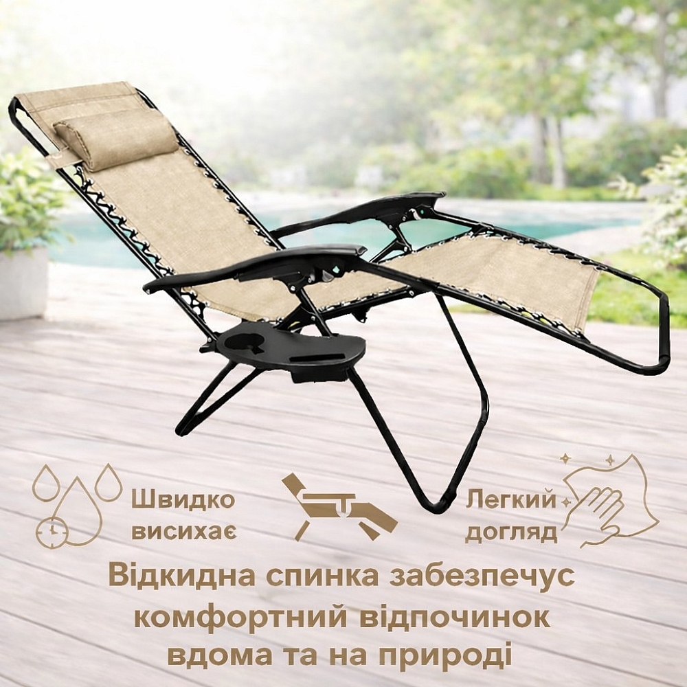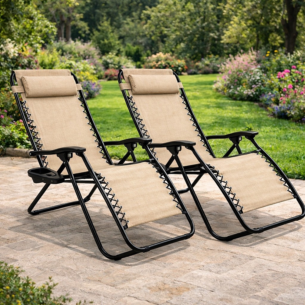 Комплект із 2 шезлонгів з підстаканниками, бежевий Axeon — це практичне рішення для комфортного відпочинку удвох вдома, на дачі або на природі. Завдяки ергономічній конструкції Zero Gravity шезлонги допомагають рівномірно розподілити вагу тіла та зменшити навантаження на спину, шию та суглоби, створюючи максимально комфортне положення для релаксу.