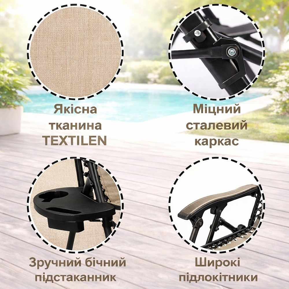 Міцний сталевий каркас забезпечує стабільність та довговічність конструкції. Максимальне навантаження на один шезлонг становить до 120 кг. Для додаткового комфорту передбачено знімний підстаканник, у якому зручно розмістити напій, телефон або інші дрібні речі.