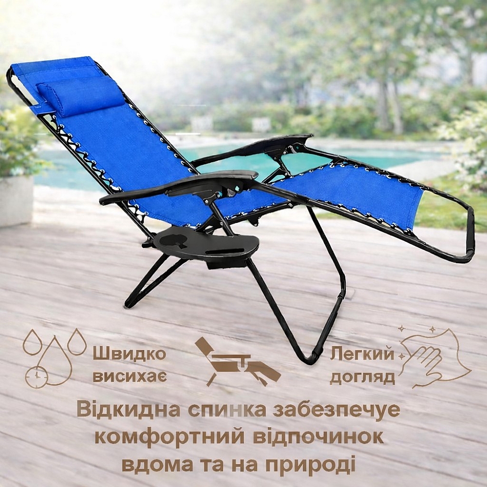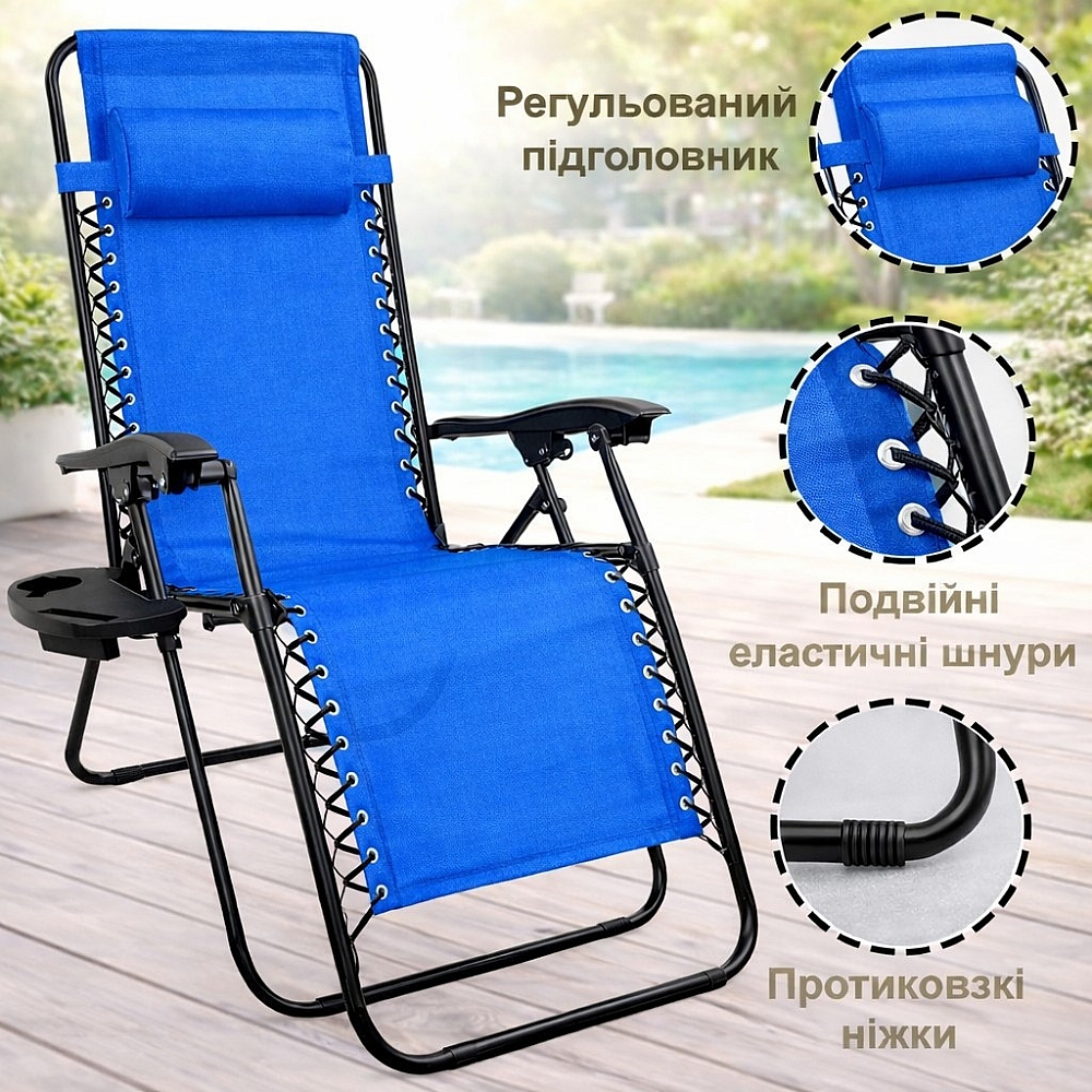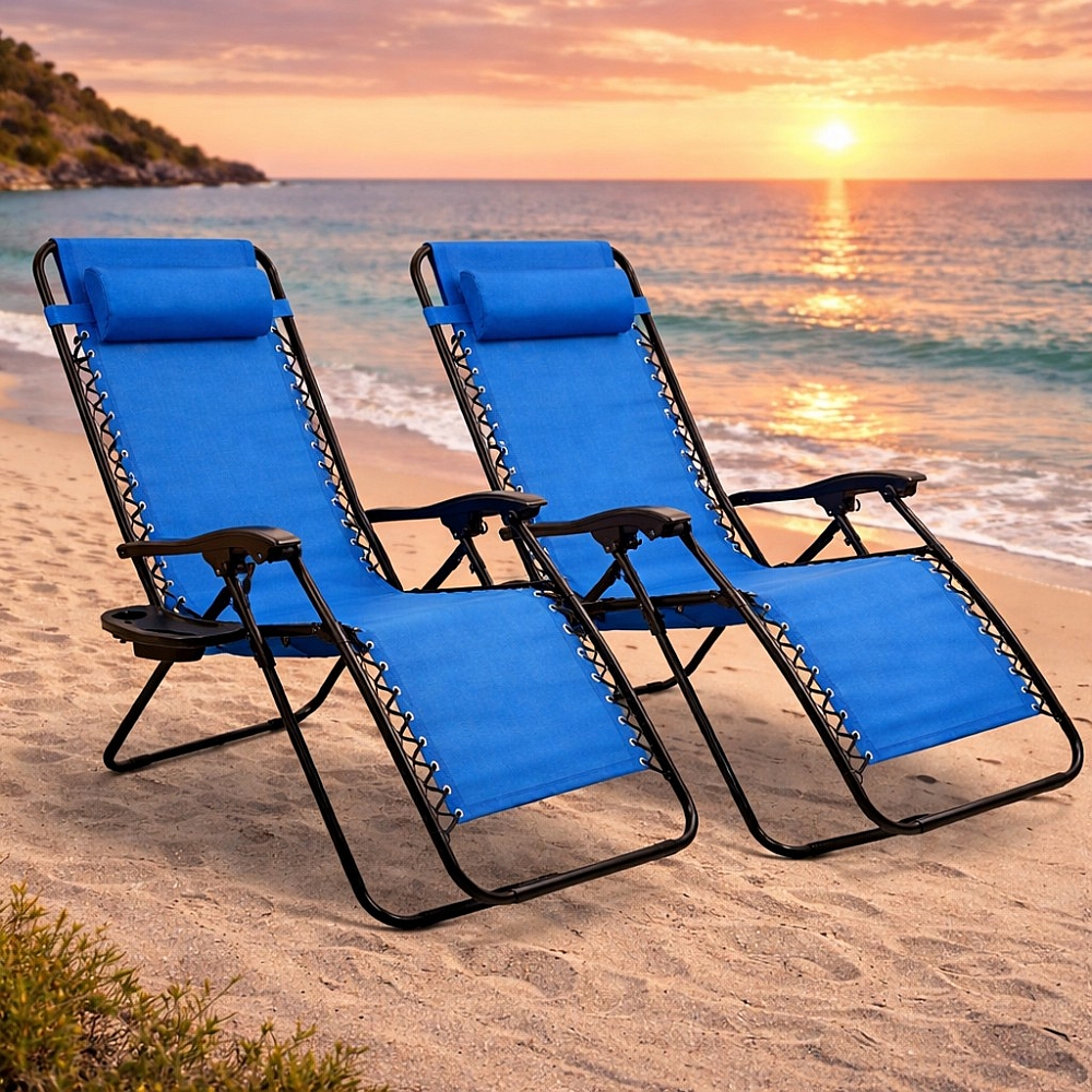 Комплект із 2 шезлонгів з підстаканниками, синій Axeon — це практичне рішення для комфортного відпочинку удвох вдома, на дачі або на природі. Завдяки ергономічній конструкції Zero Gravity шезлонги допомагають рівномірно розподілити вагу тіла та зменшити навантаження на спину, шию та суглоби, створюючи максимально комфортне положення для релаксу.