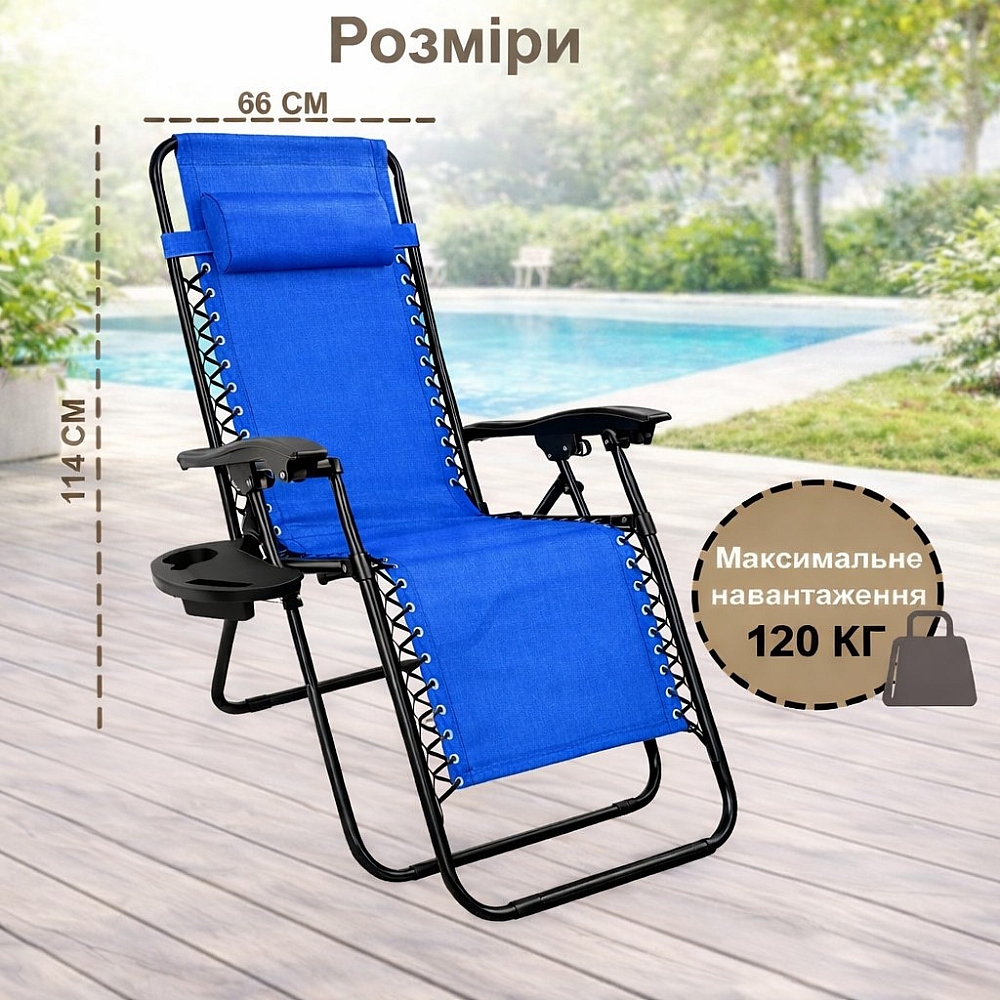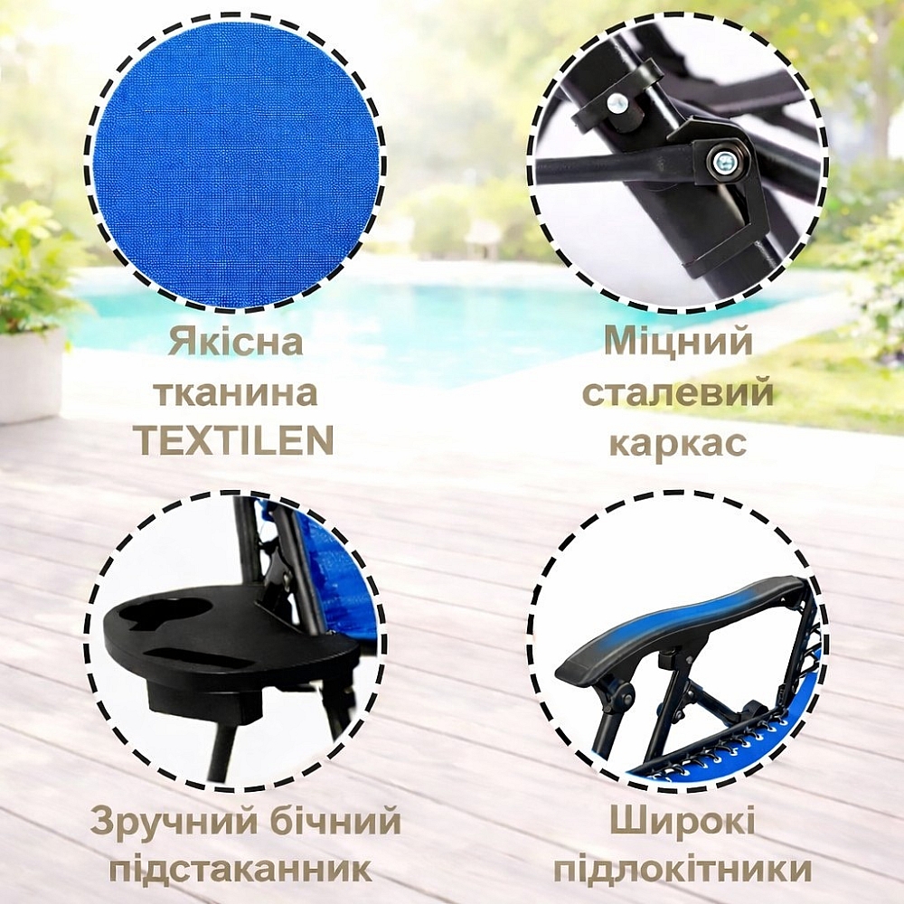 - Максимальне навантаження: 120 кг (на один шезлонг)