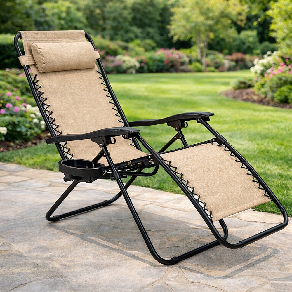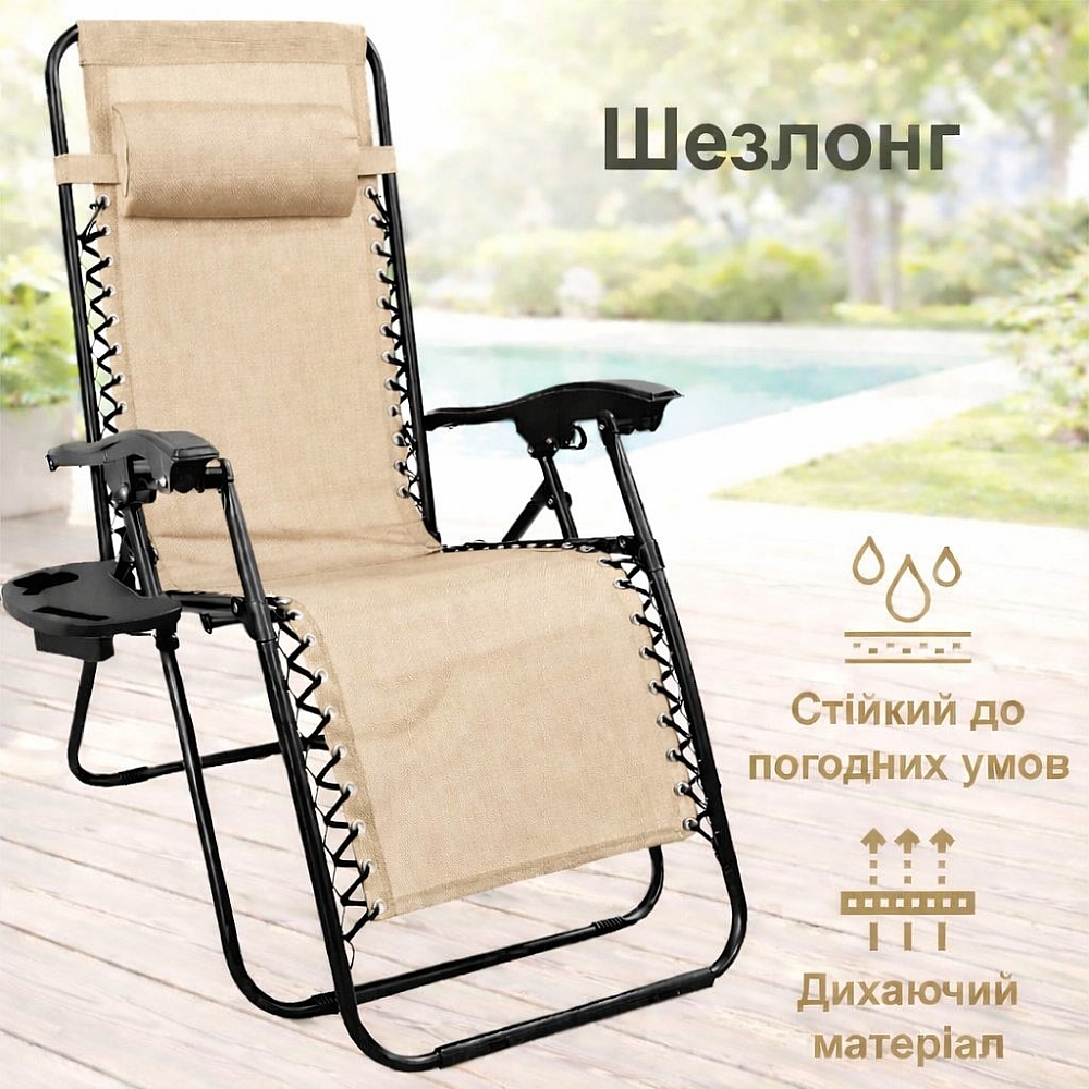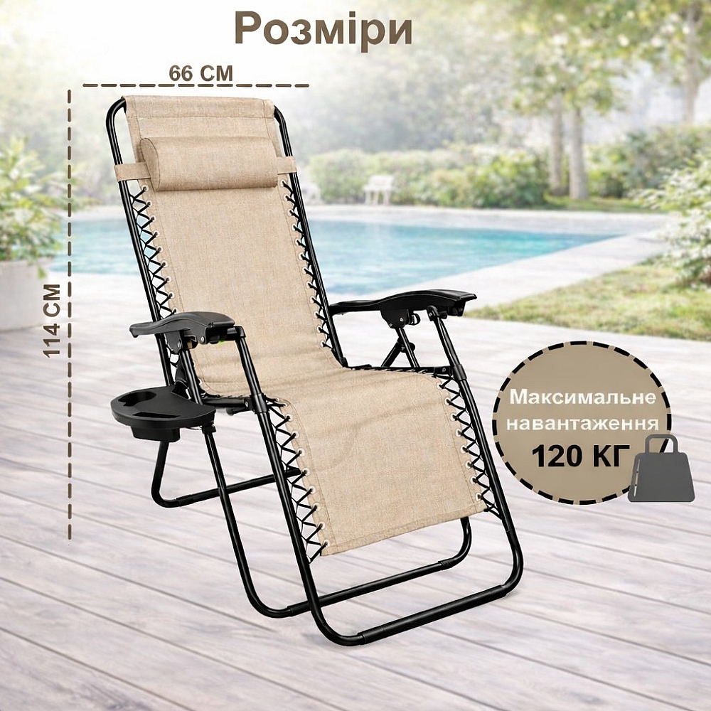 Шезлонг з підстаканником, бежевий Axeon — це комфортне та практичне рішення для відпочинку вдома, на дачі або на природі. Ергономічна конструкція з технологією Zero Gravity дозволяє рівномірно розподілити вагу тіла, зменшуючи навантаження на спину, шию та суглоби.