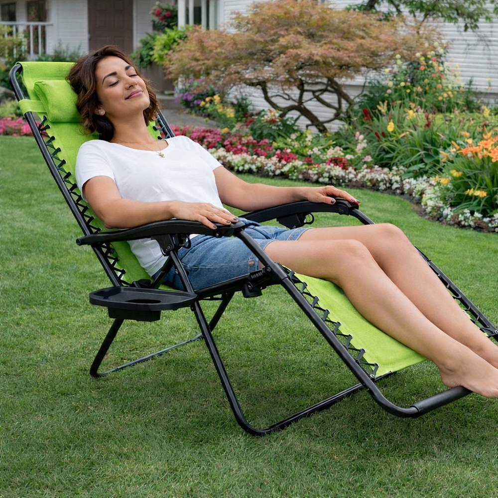 Шезлонг з підстаканником, лаймово-зелений Axeon — це комфортне та практичне рішення для відпочинку вдома, на дачі або на природі. Ергономічна конструкція з технологією Zero Gravity дозволяє рівномірно розподілити вагу тіла, зменшуючи навантаження на спину, шию та суглоби.