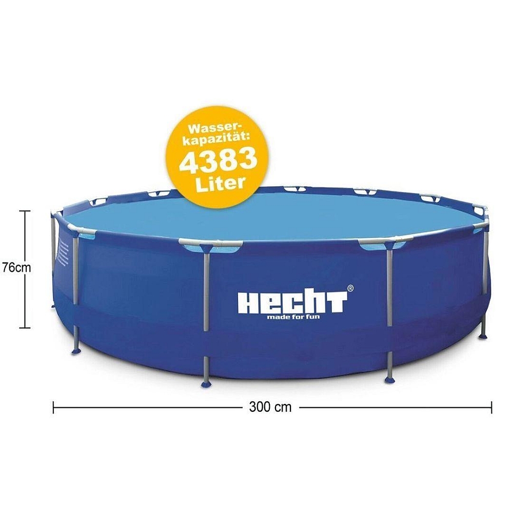 Каркасний басейн від HECHT виготовлений із міцного 3-шарового ПВХ, що гарантує тривалий термін служби та надійність.Діаметр становить 300 см та вміщує 4383 літри води.Бічна стінка має висоту 76 см і ви можете наливати воду на висоту приблизно 68 см. Басейн також обладнаний зливною пробкою, що дозволяє легко видаляти воду, коли ви закінчите користуватися ним.Стійка металева опорна конструкція забезпечує стабільність під час використання.Басейн легко і швидко збирається, що дає можливість насолоджуватися відпочинком без зайвого зусилля.