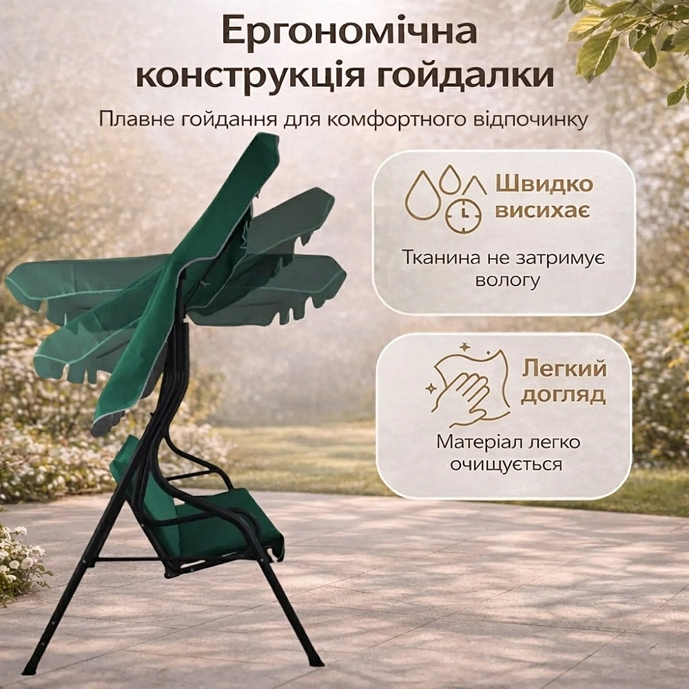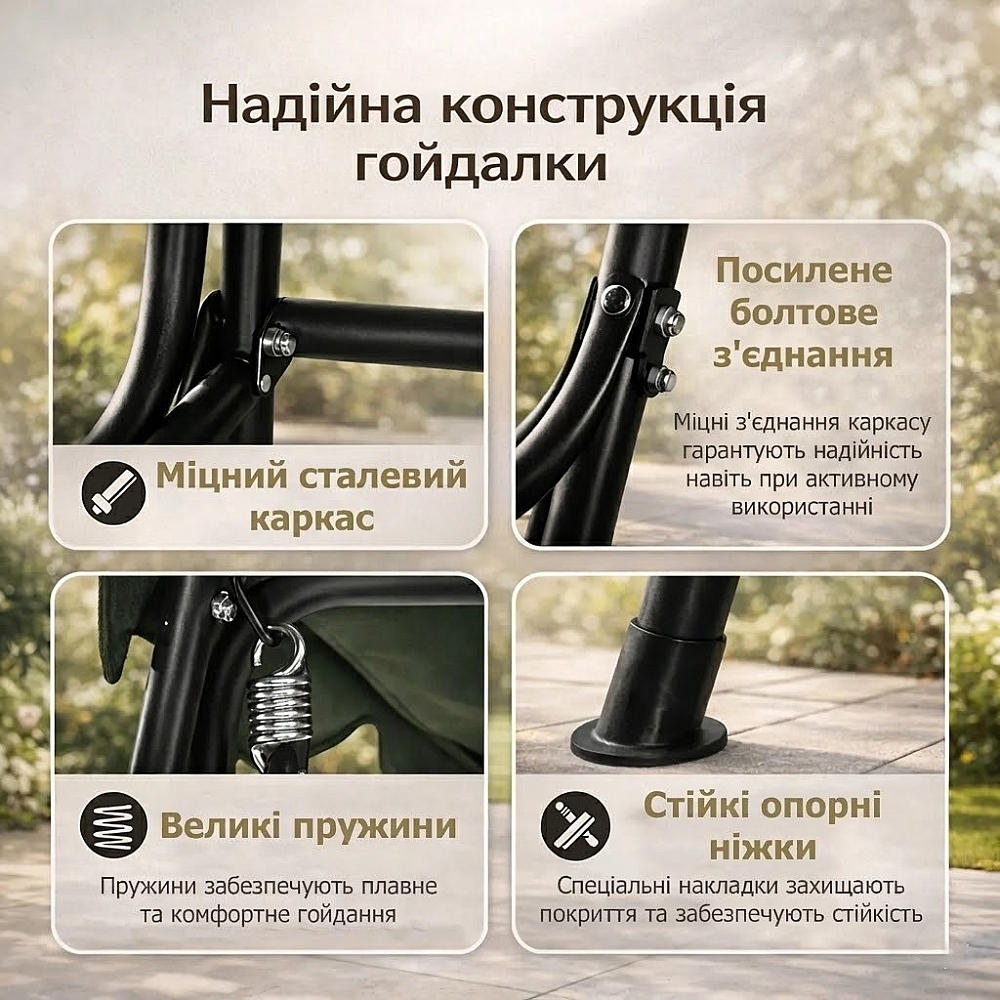 Конструкція виготовлена з міцної сталі з порошковим покриттям, що забезпечує захист від корозії та впливу погодних умов. Гойдалка відзначається високою стійкістю та надійністю, дозволяючи комфортно розміститися одразу кільком користувачам.
