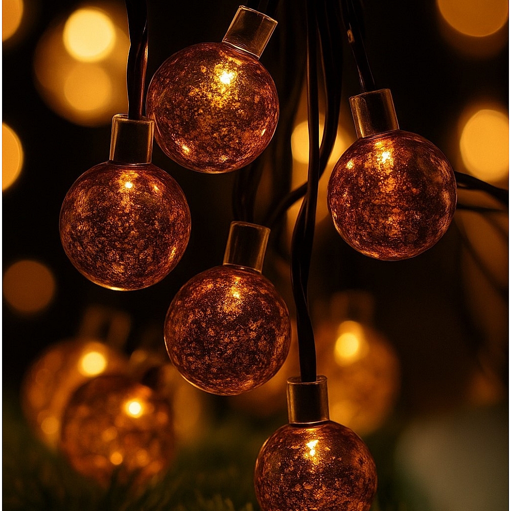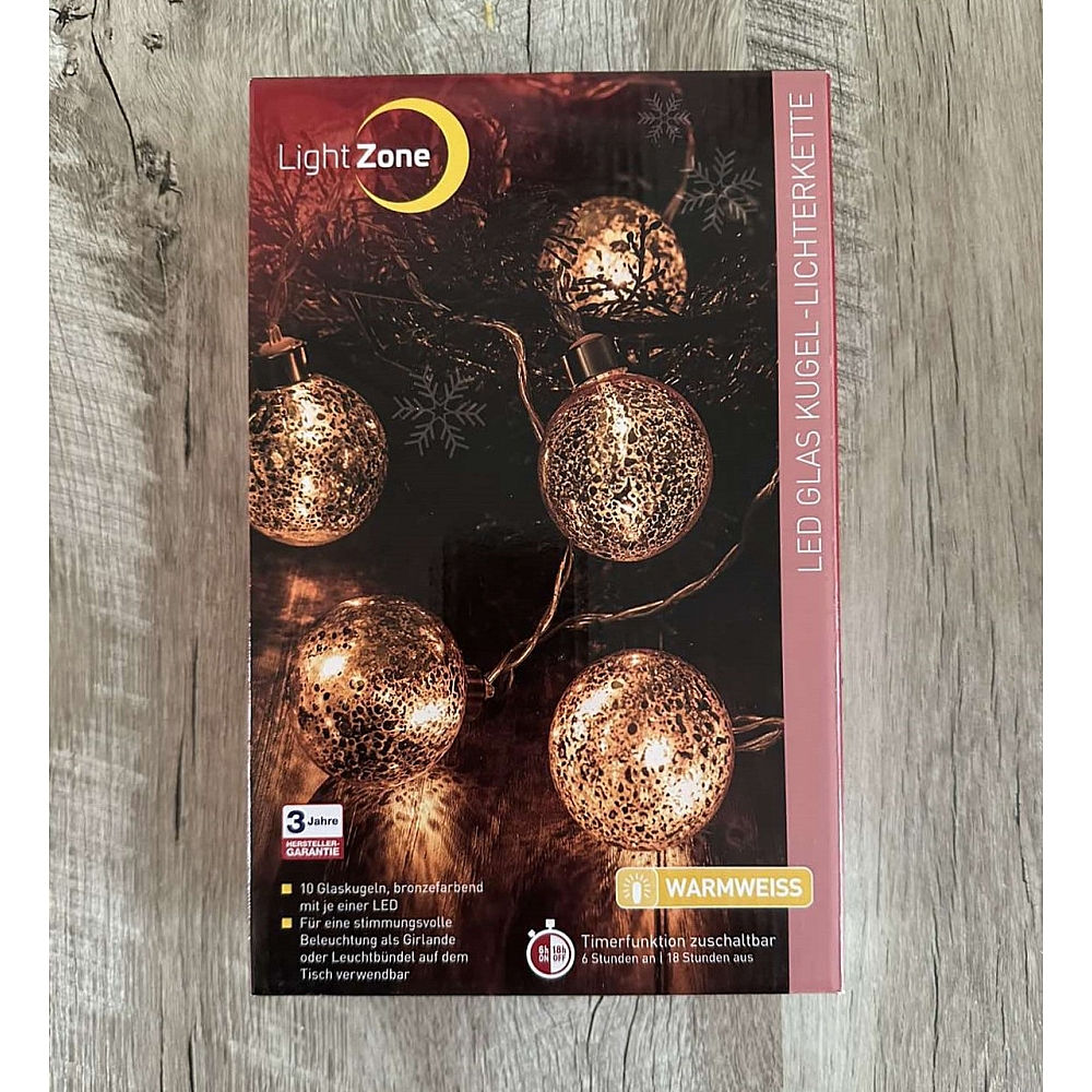 Декоративний LED-ланцюг складається з 10 скляних кульок бронзового кольору, кожна з яких має по одному світлодіоду. Загальна довжина ланцюга — 2,25 м, що підходить для прикрашання невеликих ялинок, підвіконь або святкового декору кімнати. Світло — тепле біле (warm). Має вбудований таймер 6 годин / 18 годин, що автоматично вмикає та вимикає підсвічування. Живлення — від батарей (в комплекті 2 батарейки AA).