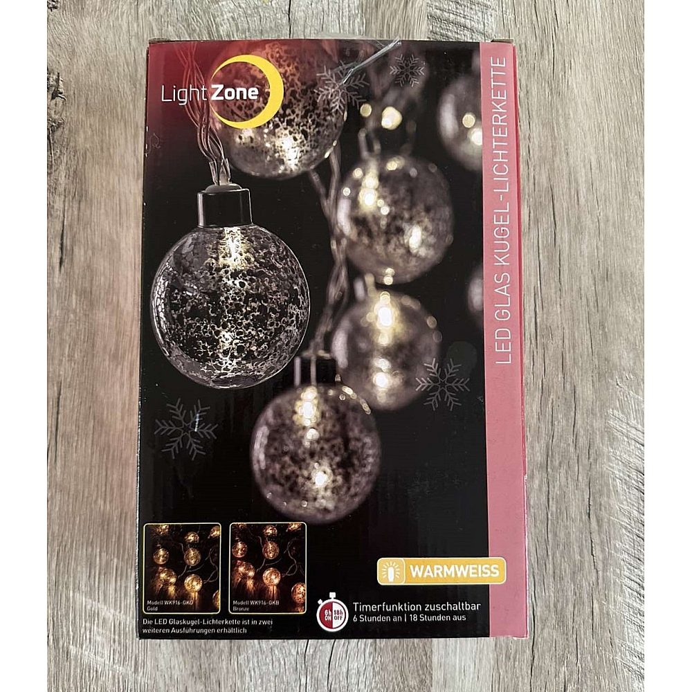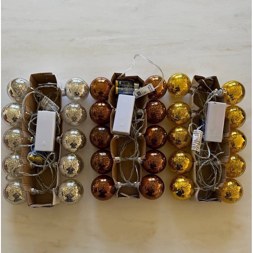 Декоративний LED-ланцюг складається з 10 скляних кульок сріблястого кольору, кожна з яких має по одному світлодіоду. Загальна довжина ланцюга — 2,25 м, що підходить для прикрашання невеликих ялинок, підвіконь або святкового декору кімнати. Світло — тепле біле (warm). Має вбудований таймер 6 годин / 18 годин, що автоматично вмикає та вимикає підсвічування. Живлення — від батарей (в комплекті 2 батарейки AA).