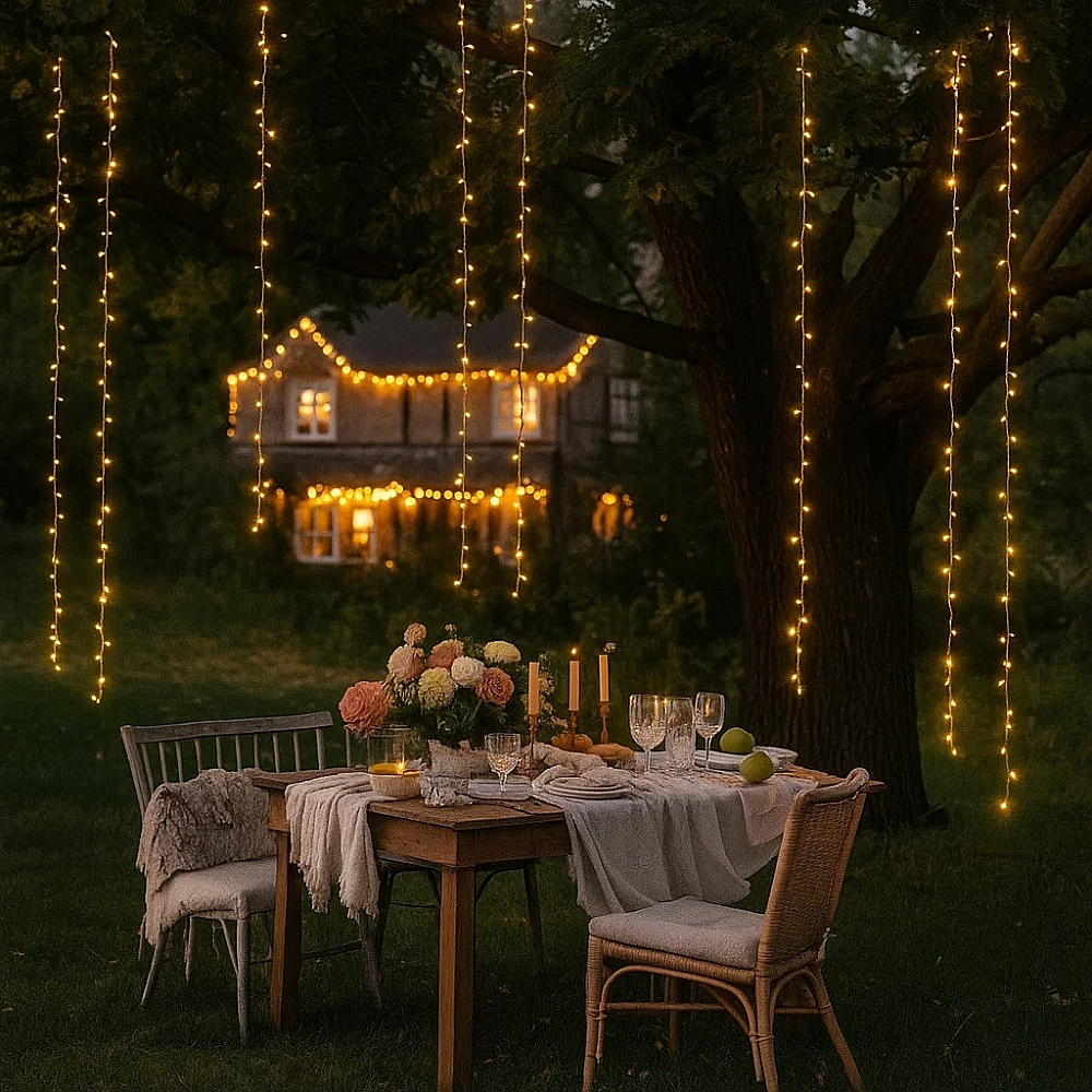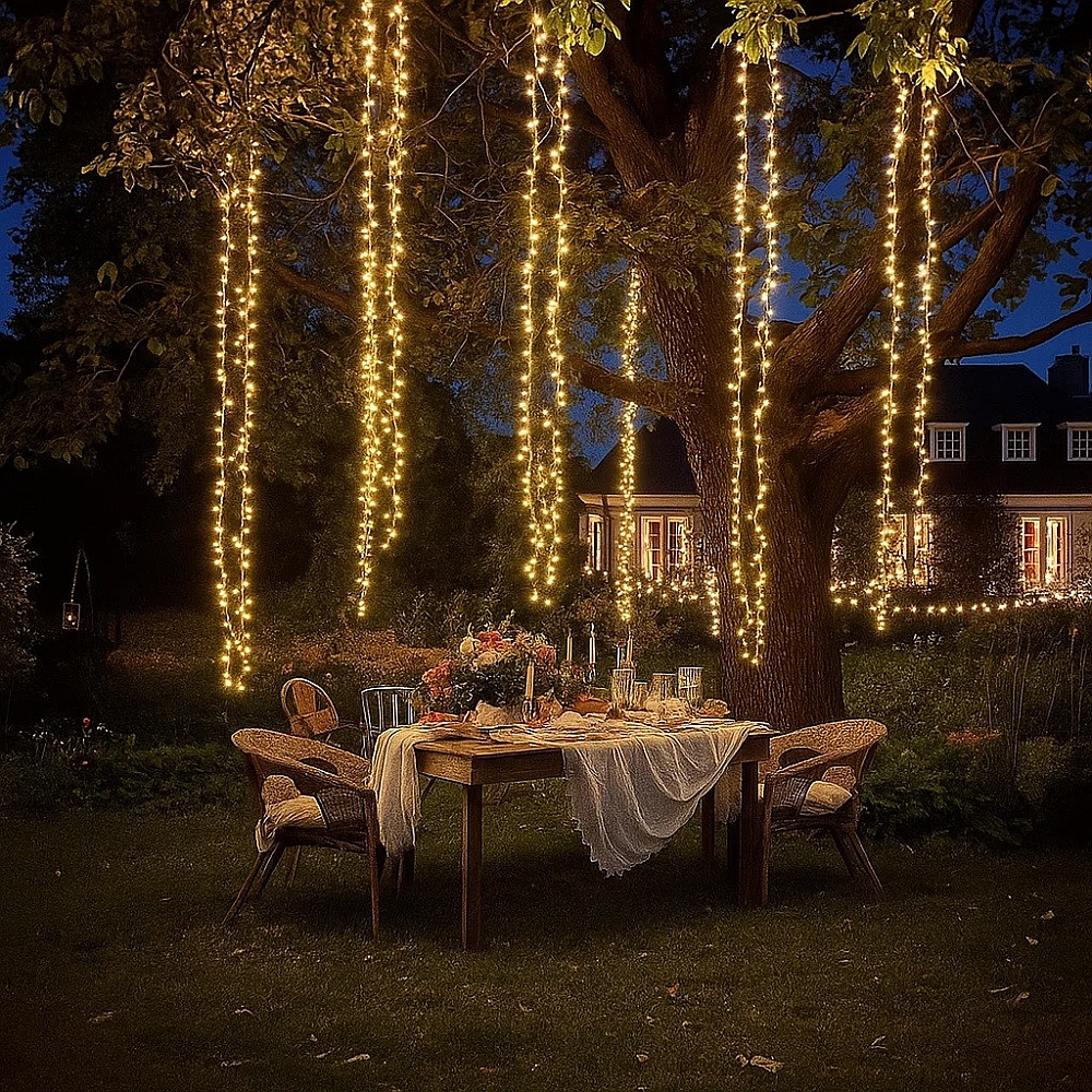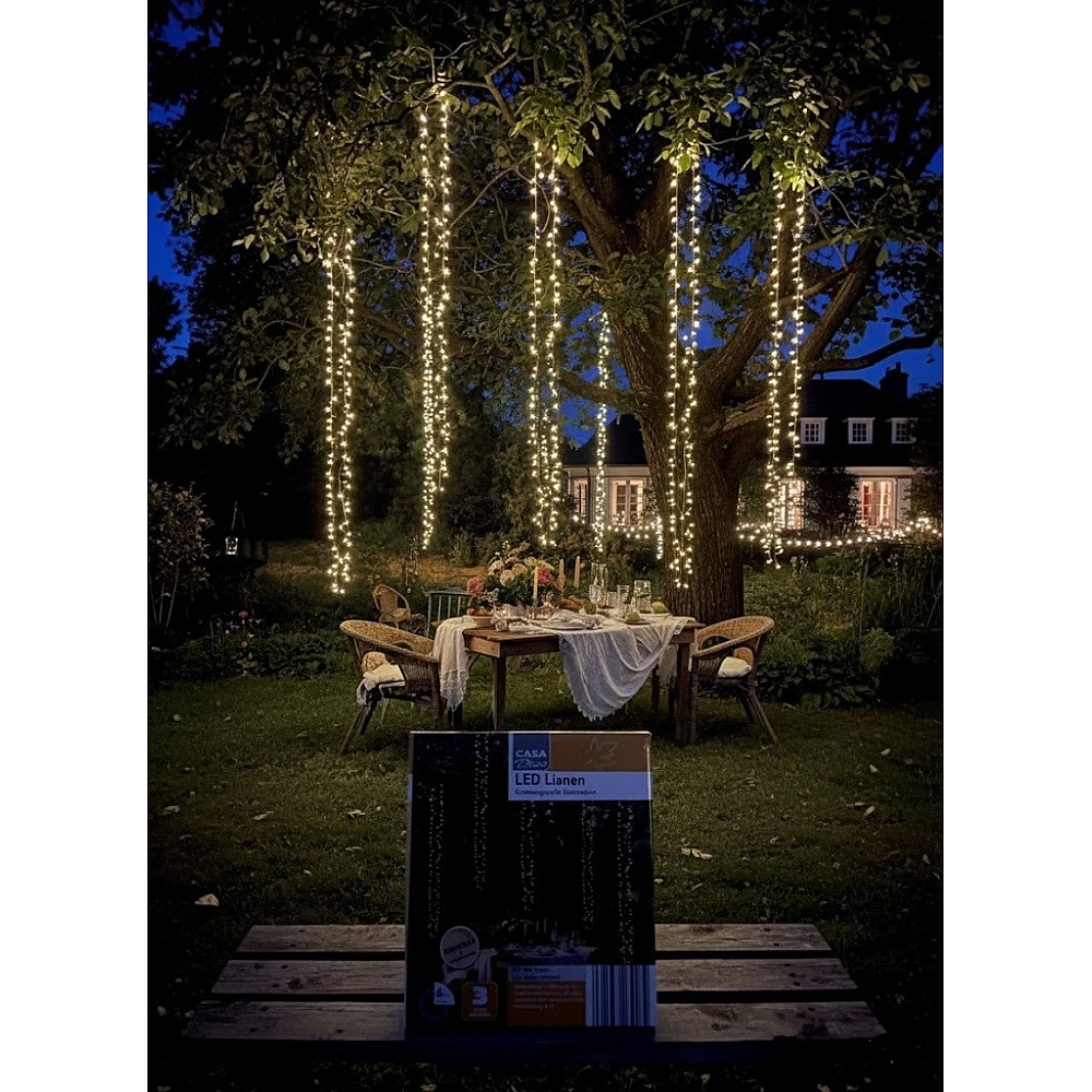 Світлодіодна гірлянда Casa Deco LED Lianen — ефектна декоративна прикраса у вигляді п’яти звисаючих ліан, що створюють атмосферу затишку й свята. Завдяки теплому білому світлу вона надає простору чарівного сяйва, ідеально підходить для прикрашання альтанок, вікон, веранд, камінів або стін. Може використовуватись як у приміщенні, так і на вулиці — гірлянда має надійний захист від вологи. Оснащена функцією димування з 4 рівнями яскравості та таймером на 6 годин, що автоматично вмикає та вимикає освітлення.