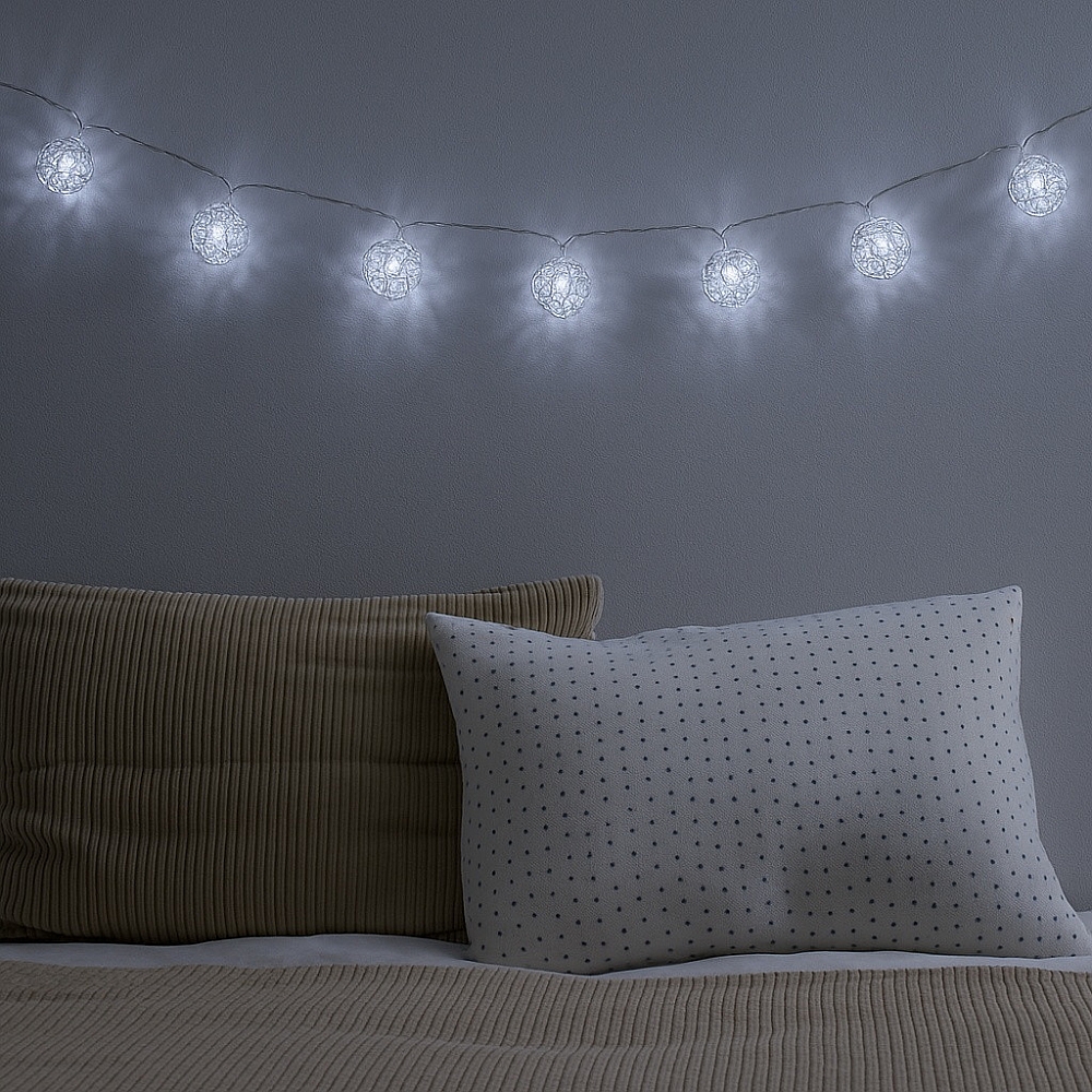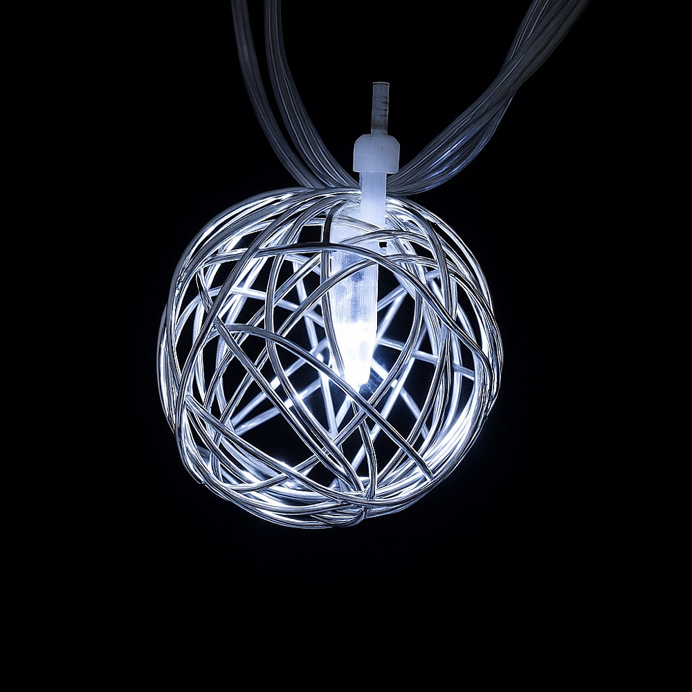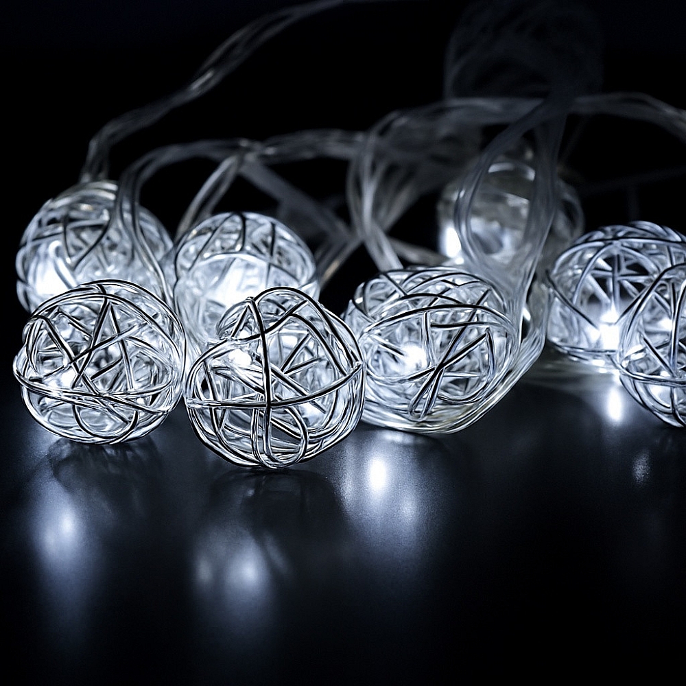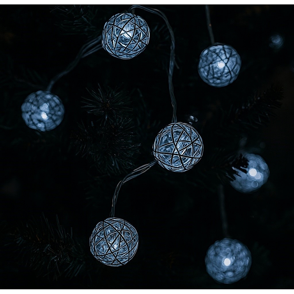 Ця гірлянда складається з десятьох металевих кульок, освітлених теплосвітними LED. Вона працює автономно — від батарейок, — не потребує розеток і легко розміщується в будь-якому місці: на ялинці, у кімнаті, у вікні. Компактний блок живлення має прозорий корпус і кнопку ввімкнення. Гірлянда створює святкову атмосферу з м’яким нейтральним холодним світлом.