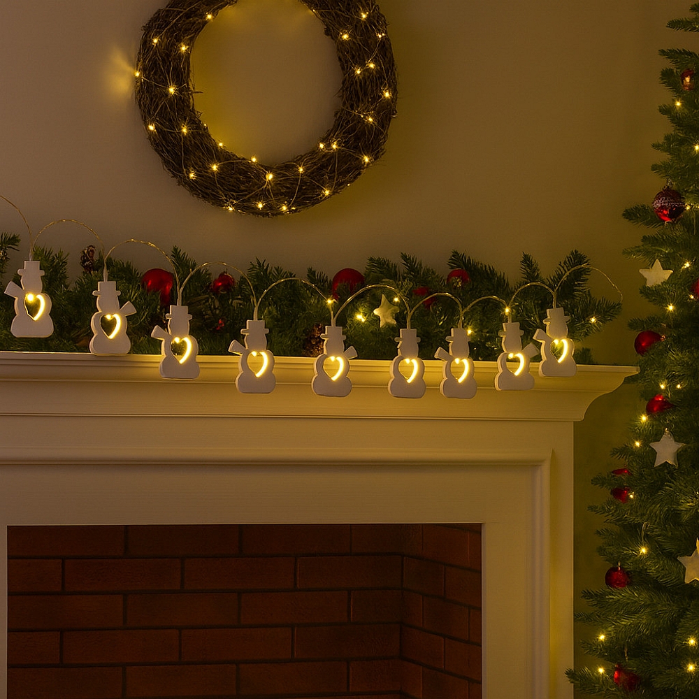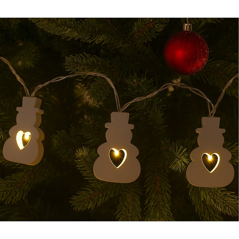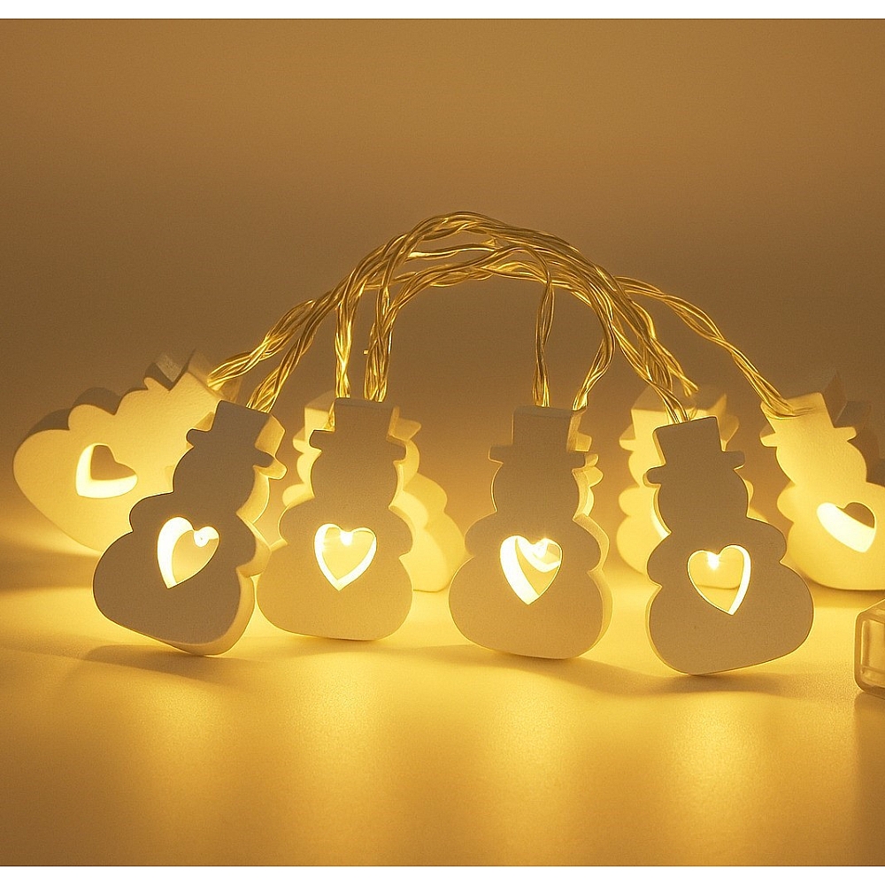 Світлодіодна гірлянда "Дерев’яні Сніговики" створює чарівну атмосферу тепла й затишку у вашому домі. Вона складається з 10 лампочок у формі сніговичків, виконаних із натурального дерева, що додає природного шарму та ніжного святкового блиску.