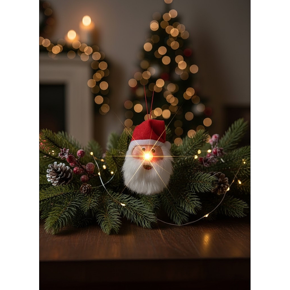 Світлодіодна ялинкова кулька LightZone “Санта” — святкова декоративна прикраса з миготливим носиком та теплим білим підсвічуванням. Її можна підвісити на ялинку або поставити на полицю чи стіл. Автоматичний таймер забезпечує 6 годин світіння та 18 годин паузи.