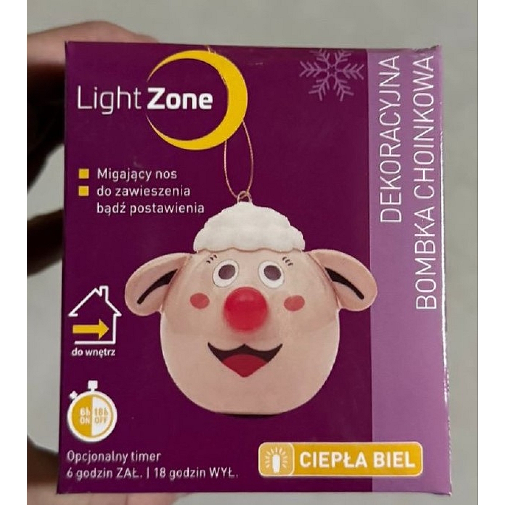 Світлодіодна прикраса LightZone Dekoracyjna Bombka Choinkowa LED — це чарівна ялинкова кулька з милим обличчям вівці та миготливим носиком, який світиться теплим білим кольором. Завдяки милому дизайну кулька чудово доповнює новорічний декор, додаючи йому грайливості та святкового настрою. Її можна підвісити на ялинку або поставити на полицю чи стіл. Таймер автоматично вмикає підсвічування на 6 годин і вимикає на 18 годин.