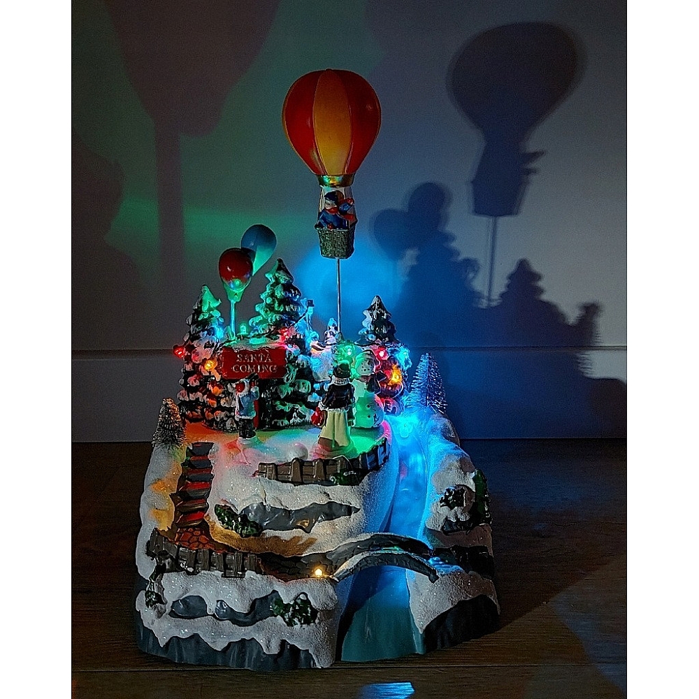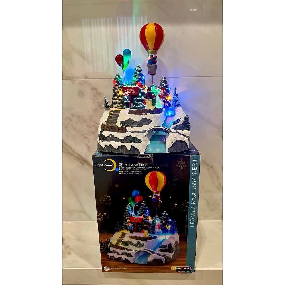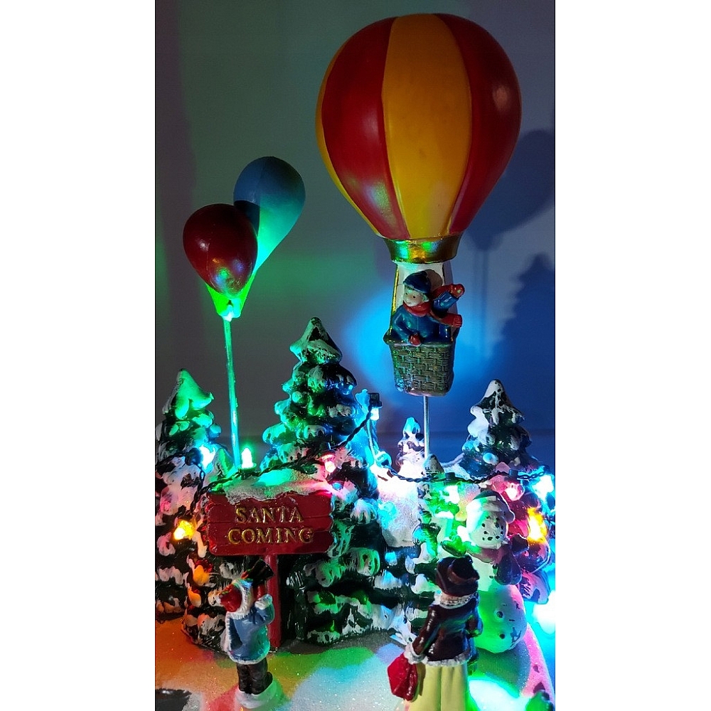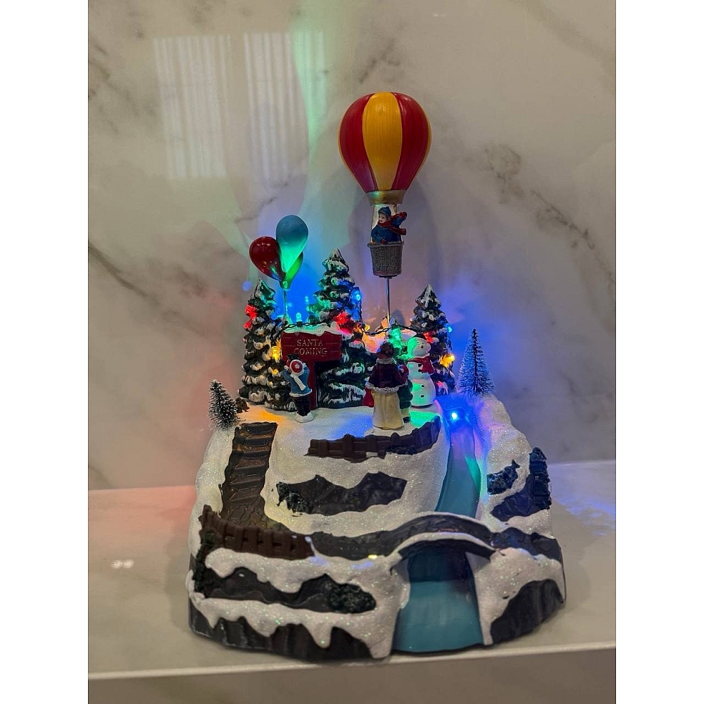 Декоративна святкова карусель LightZone у вигляді зимового пейзажу з повітряною кулею — це втілення чарівної різдвяної атмосфери. Композиція включає засніжені ялинки, фігурки, місточок та фірмову вивіску «Santa is coming», а головний акцент — рухома повітряна куля, що обертається над сценою.