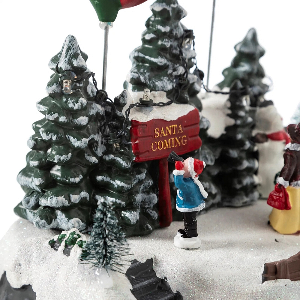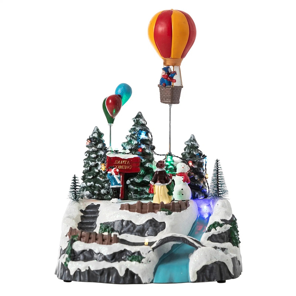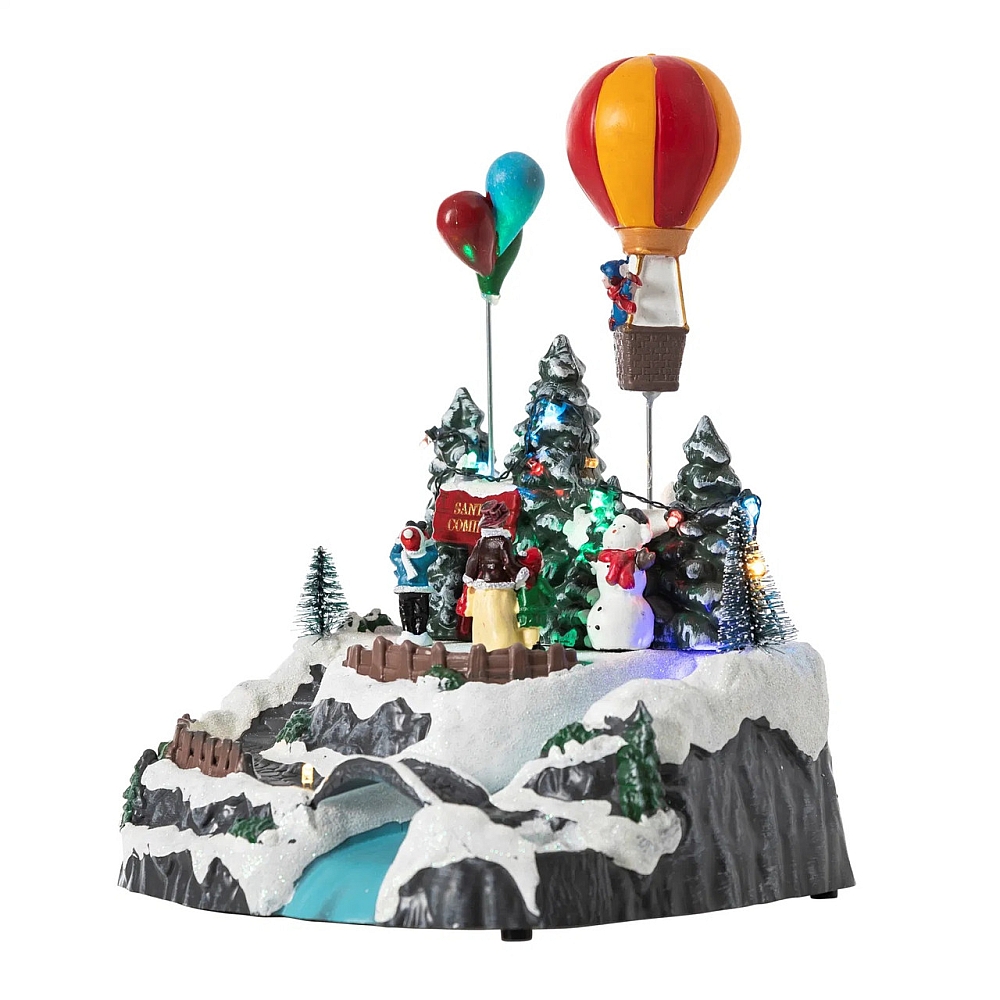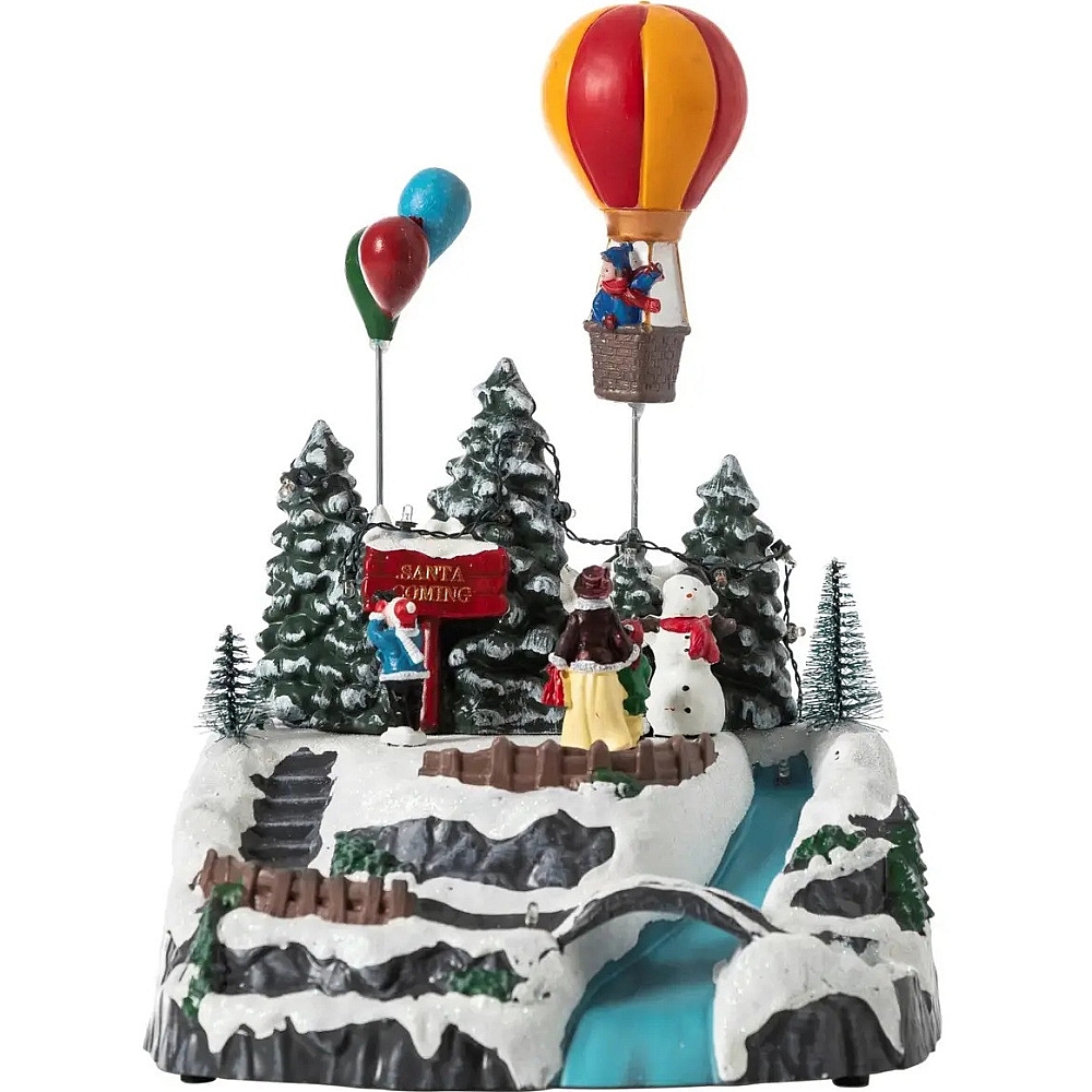 Декоративна святкова карусель LightZone у вигляді зимового пейзажу з повітряною кулею — це втілення чарівної різдвяної атмосфери. Композиція включає засніжені ялинки, фігурки, місточок та фірмову вивіску «Santa is coming», а головний акцент — рухома повітряна куля, що обертається над сценою.