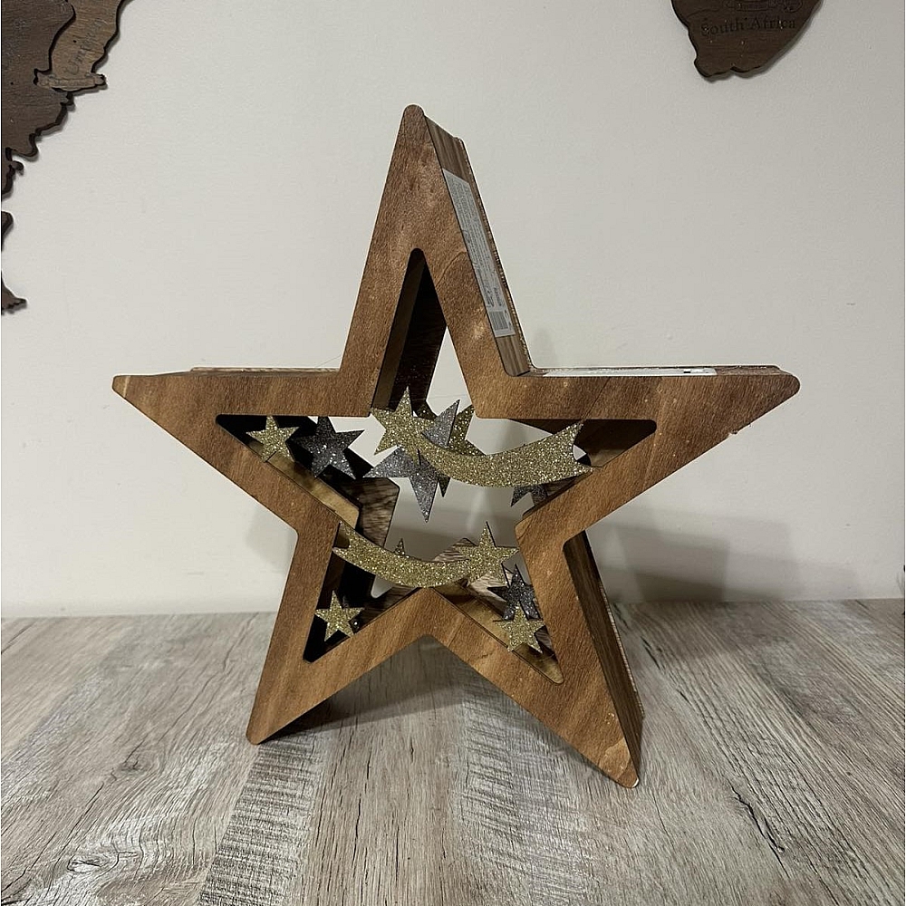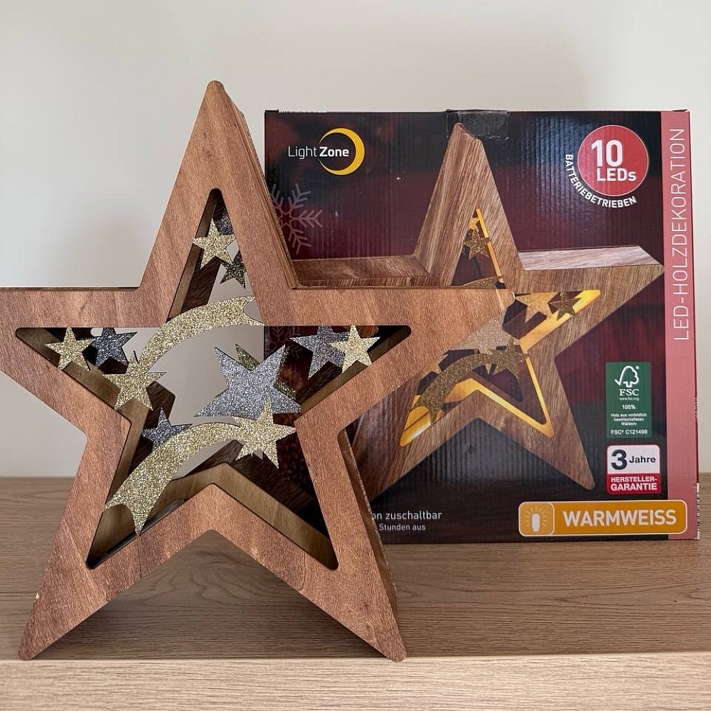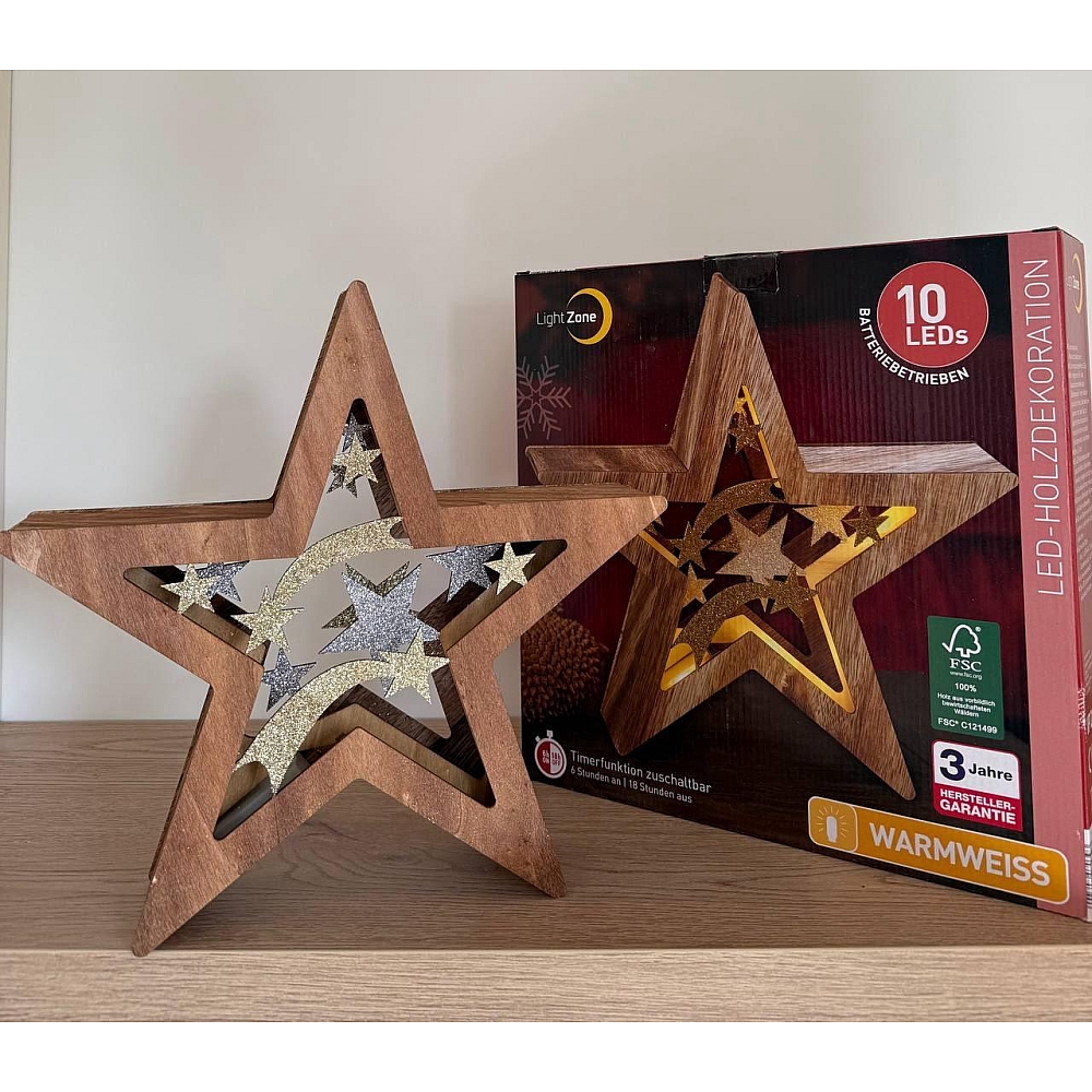 Ця декоративна зірка виготовлена з деревини, оснащена 10 LED-лампами теплого білого кольору з зірками всередині. Діаметр становить близько 35 см, глибина ~5 см. Живлення здійснюється від батарей (2×AA), є вбудований таймер на 6 годин з автоповтором.