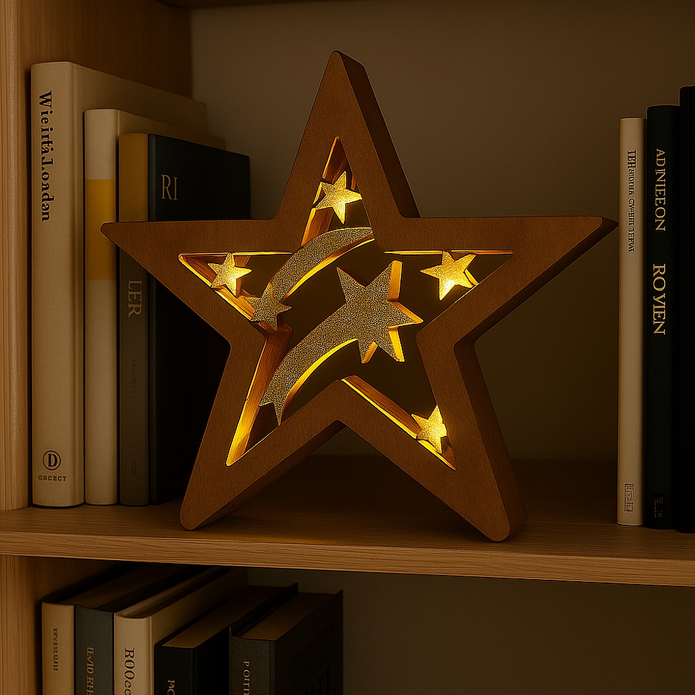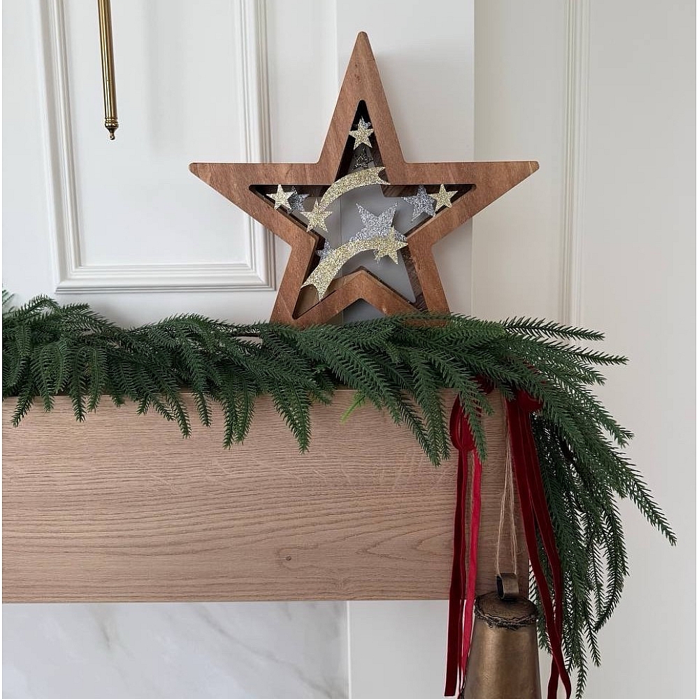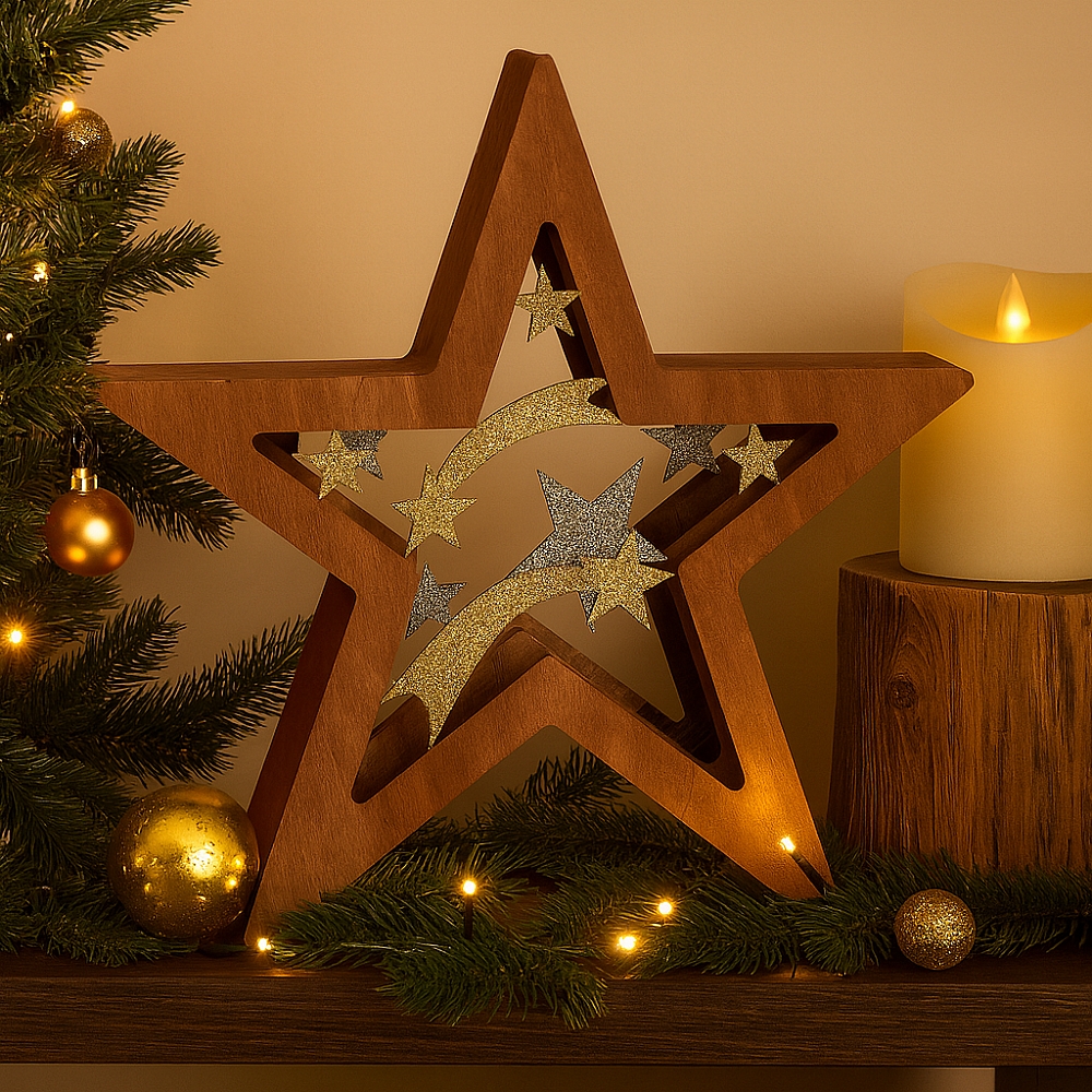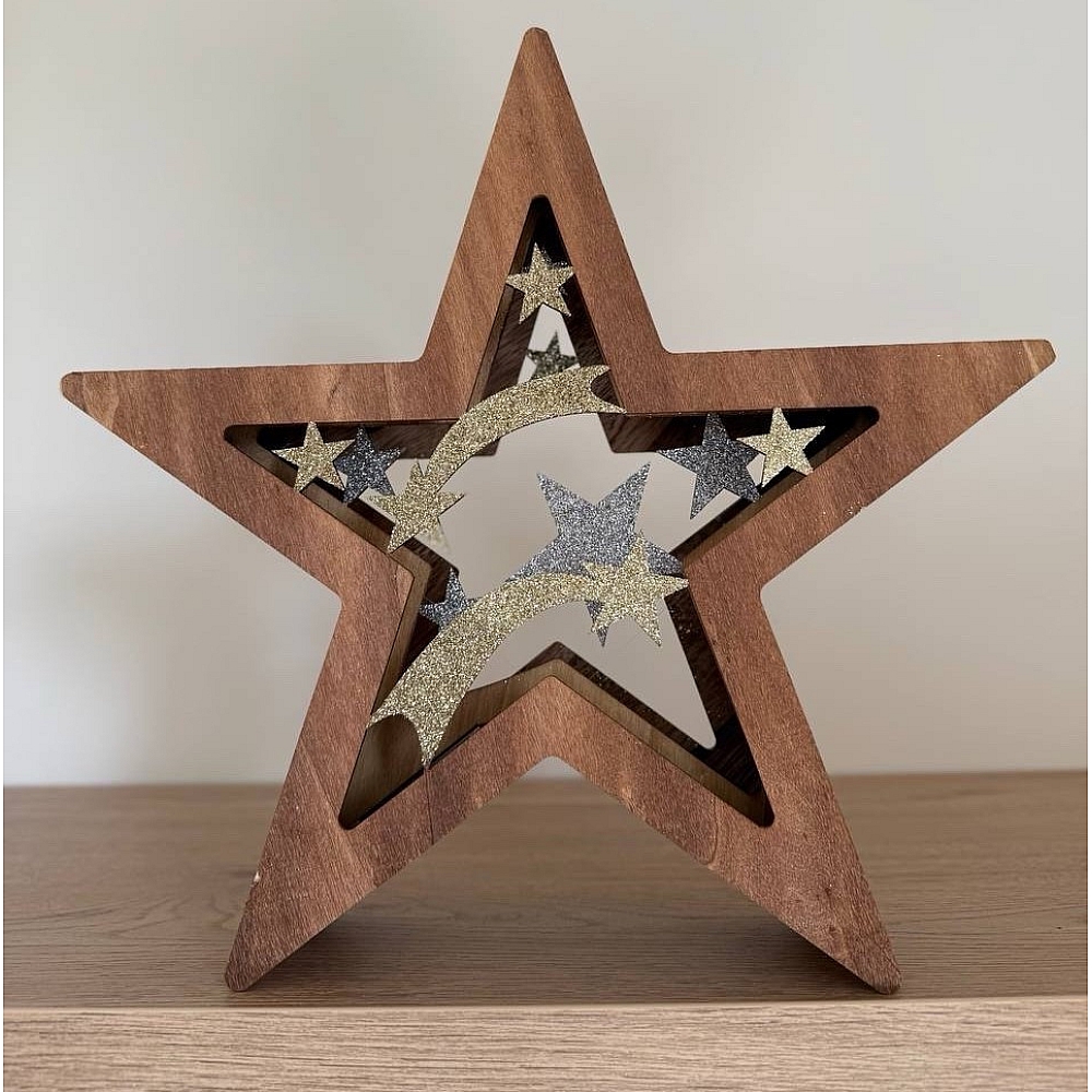 Ця декоративна зірка виготовлена з деревини, оснащена 10 LED-лампами теплого білого кольору з зірками всередині. Діаметр становить близько 35 см, глибина ~5 см. Живлення здійснюється від батарей (2×AA), є вбудований таймер на 6 годин з автоповтором.