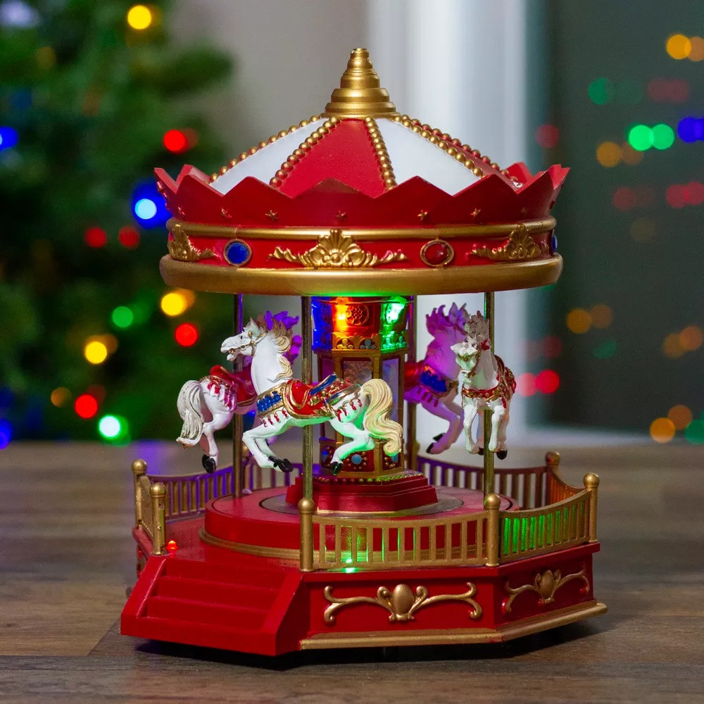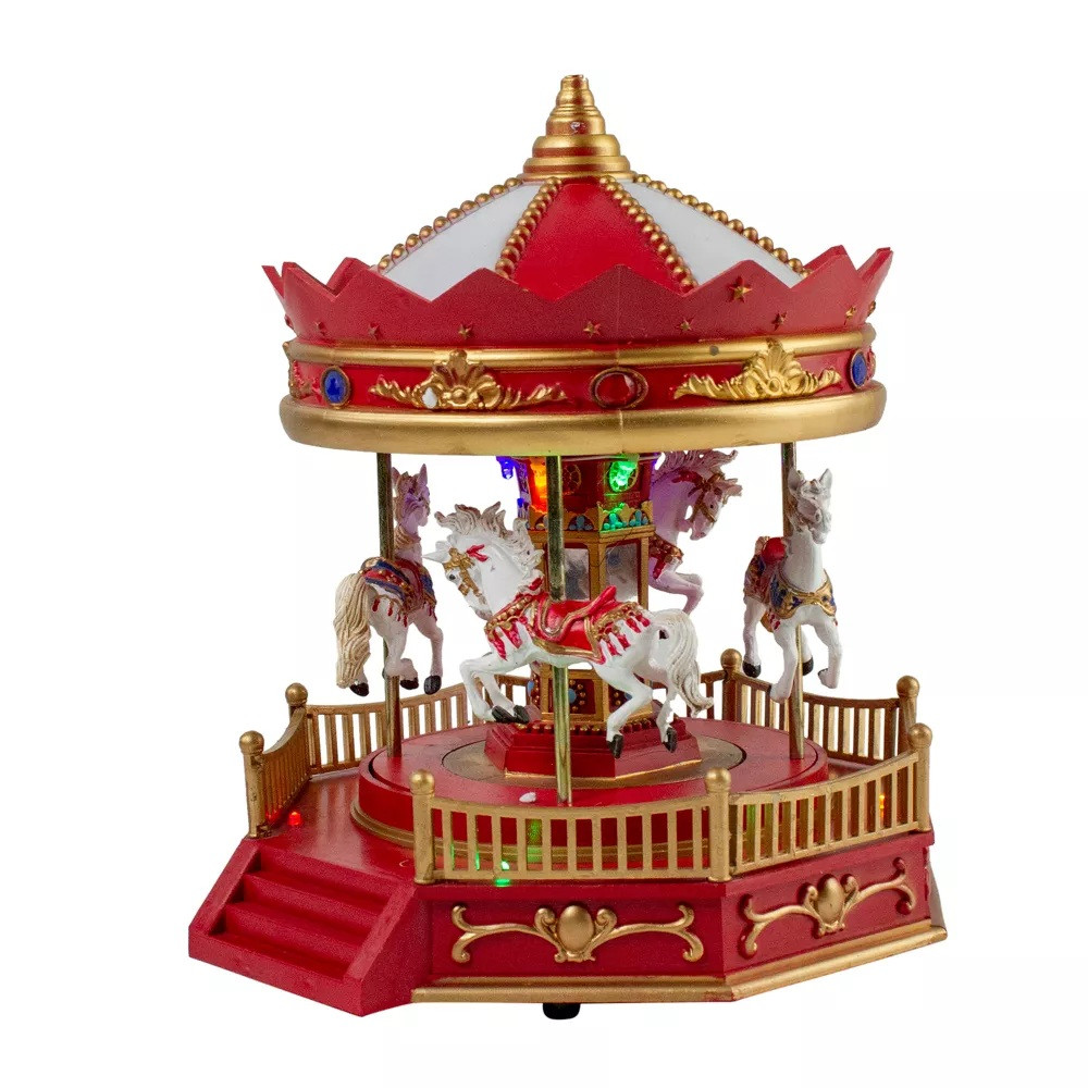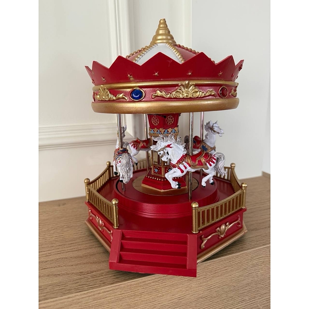 Ця LED-музична карусель — святковий декоративний елемент, який оживляє інтер’єр або вітрину. Карусель із чотирма фігурками коней обертається під м’яким світлом багатьох кольорів і супроводжується різдвяними мелодіями.