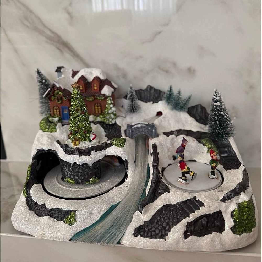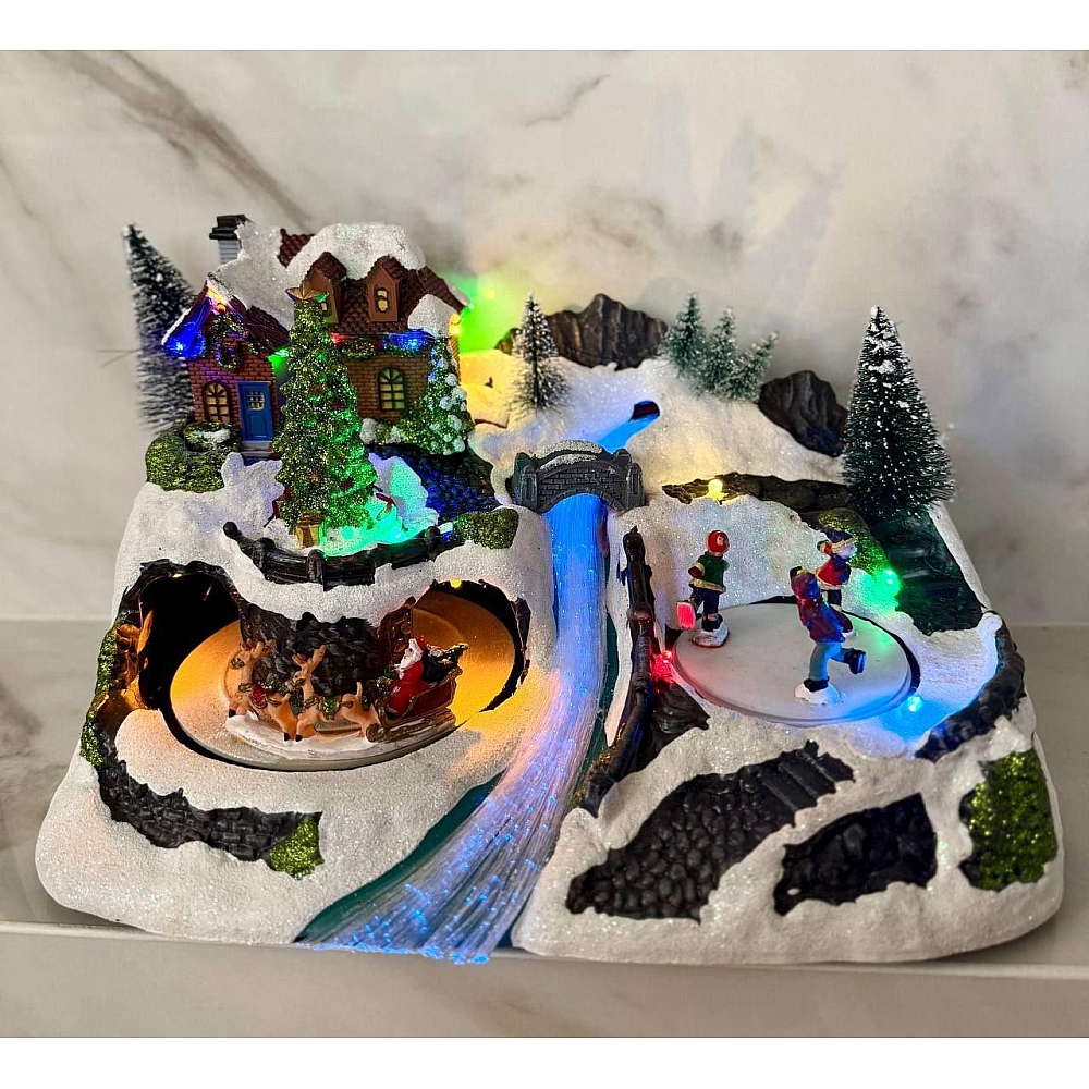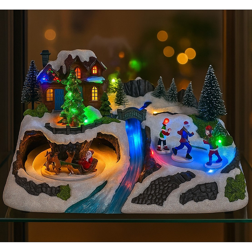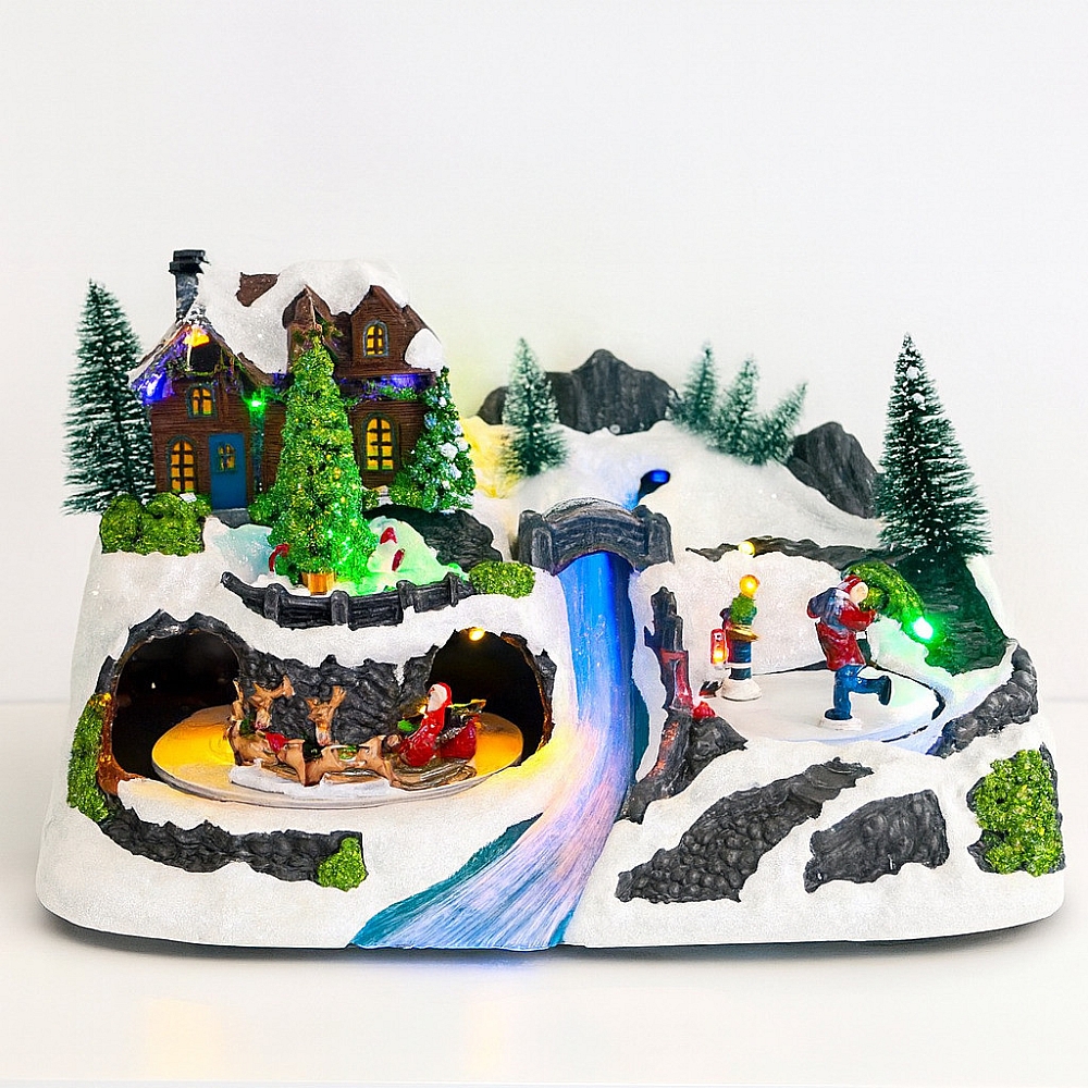 Світлодіодний набір обладнаний рухомими санями оленів і Санти всередині тунелю, ковзанка з фігурками, місток і річка, ялинки — динамічний і святковий ефект.